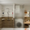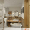 Celkový dojem této koupelny vyvolává harmonii mezi praktičností, přírodním stylem a moderní elegancí, kde každý prvek podporuje příjemnou atmosféru klidu a pohodlí.