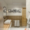 Koupelna kombinuje přírodní dřevo s čistou bílou barvou, která pokrývá horní část stěn. Dřevěné obložení do poloviny výšky přináší do prostoru teplý a útulný pocit, zatímco bílá část stěn působí svěže a vzdušně. Tento kontrast vytváří příjemnou rovnováhu mezi moderním a přírodním stylem.