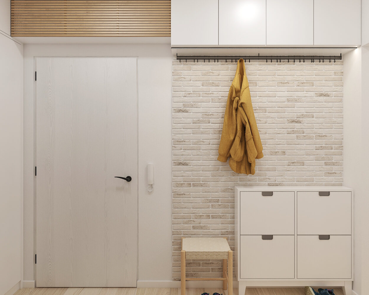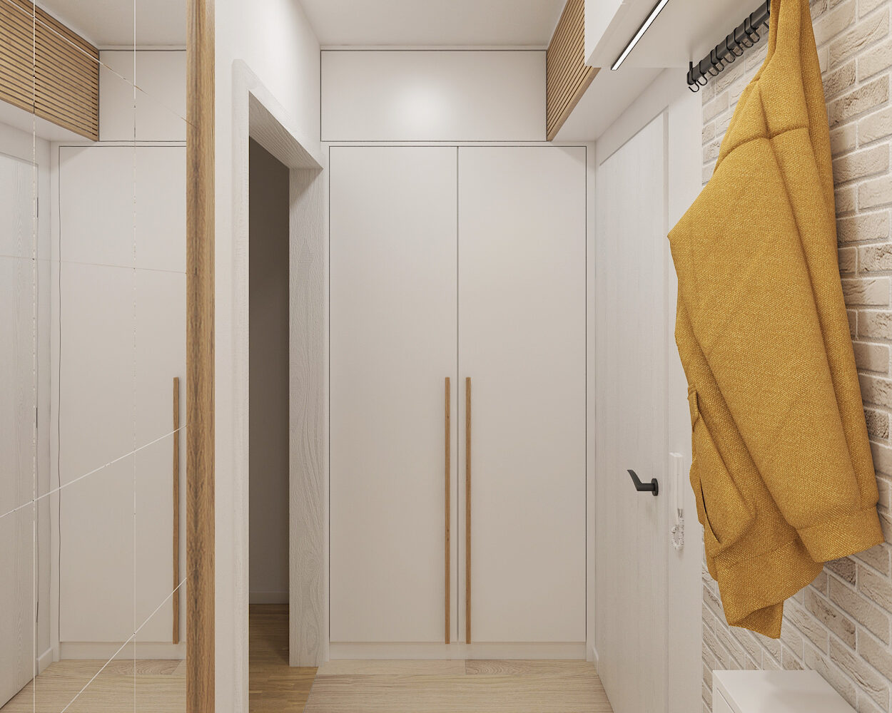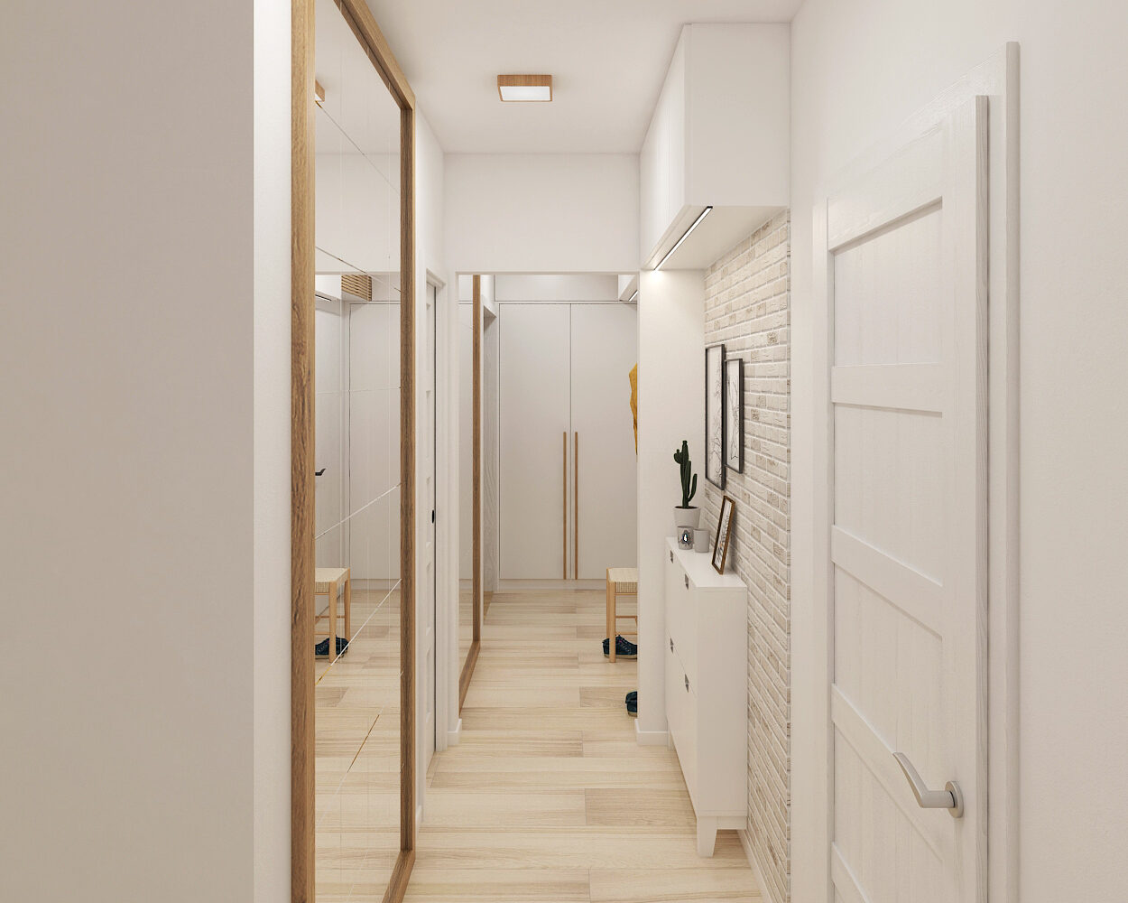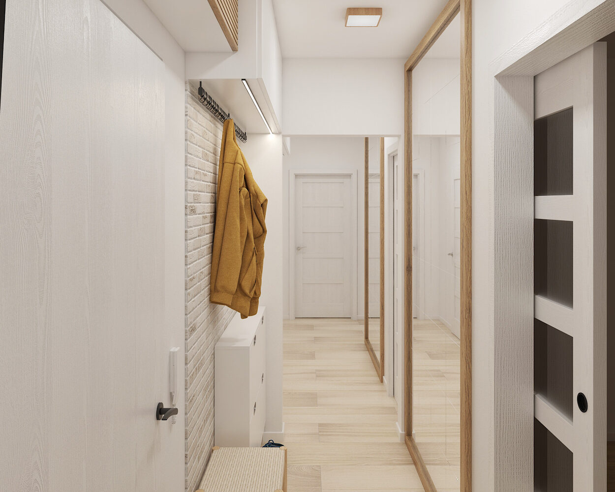 Z chodby vede několik dveří – některé otevřené, jiné zavřené, vzbuzující zvědavost, co se skrývá za nimi. Ticho prostoru přerušuje jen tlumený krok nebo šustění oblečení. Místo působí klidně, jako vstupní brána do zbytku domova, kde začíná každý návrat.