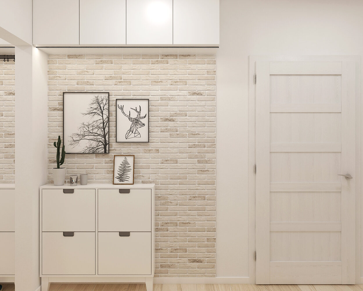 V pravém rohu stojí botník, rovněž bílý, ladící se stěnami. Na jeho horní ploše spočívá dekorace – kombinace sušených květin ve skleněné váze a malý svícen. Tyto drobnosti dodávají chodbě útulnost a osobitý charakter. Botník skrývá obuv, která by jinak rušila čistý dojem prostoru. Celé uspořádání působí promyšleně, každý prvek má své místo i účel.