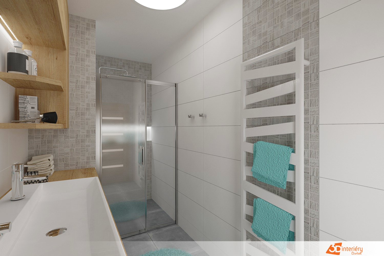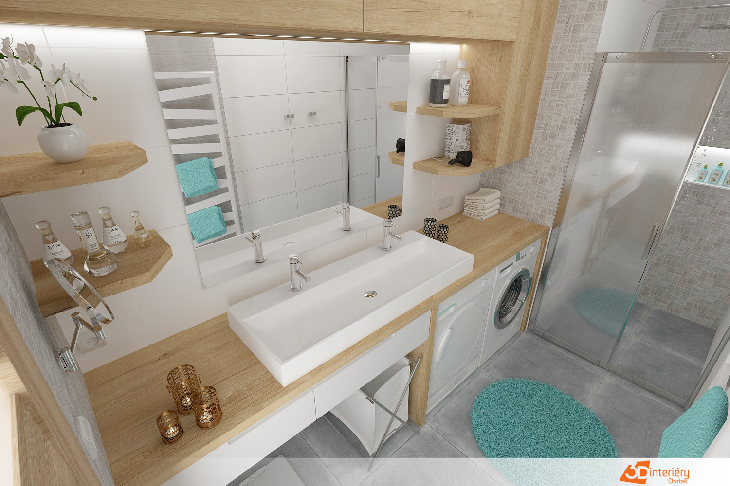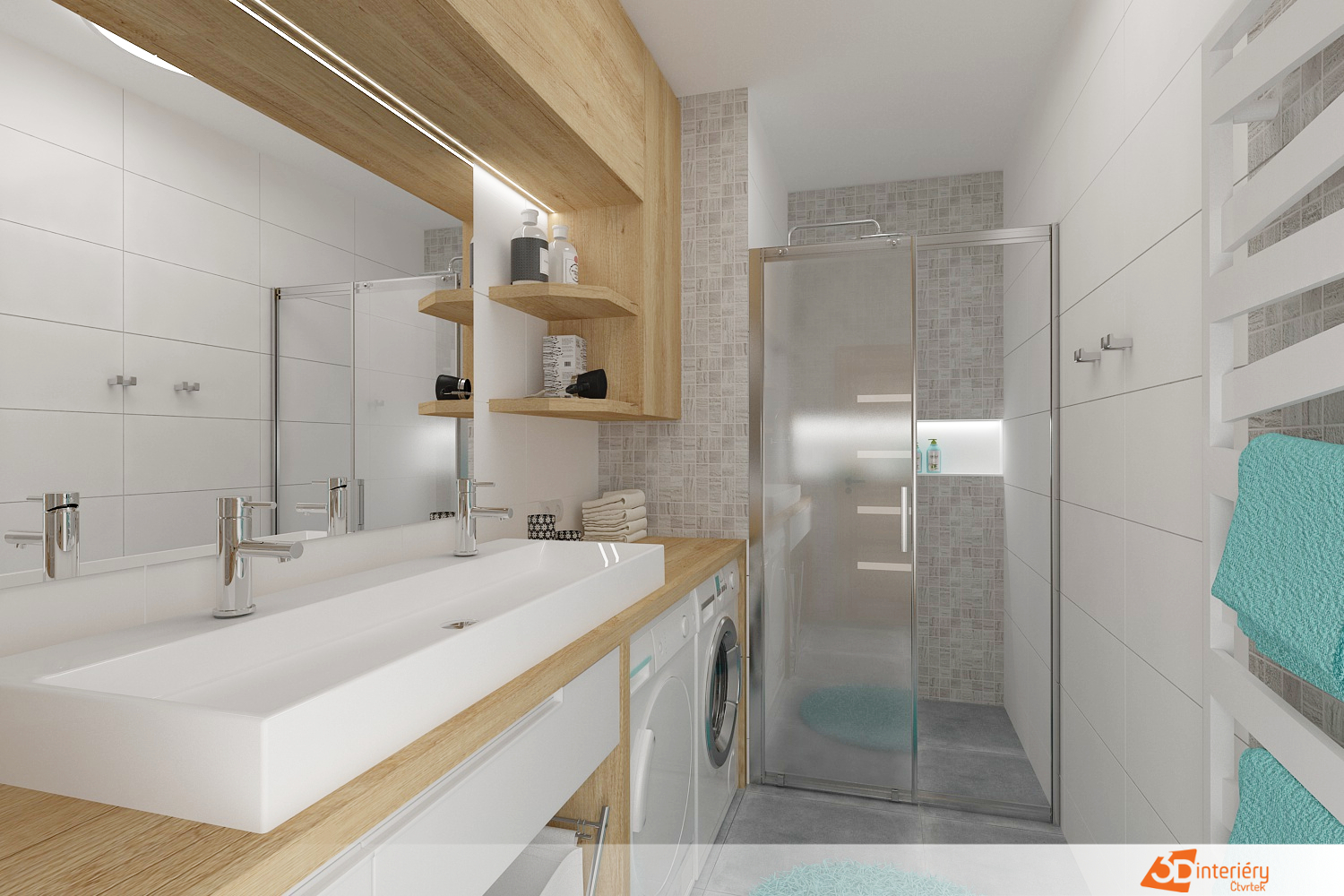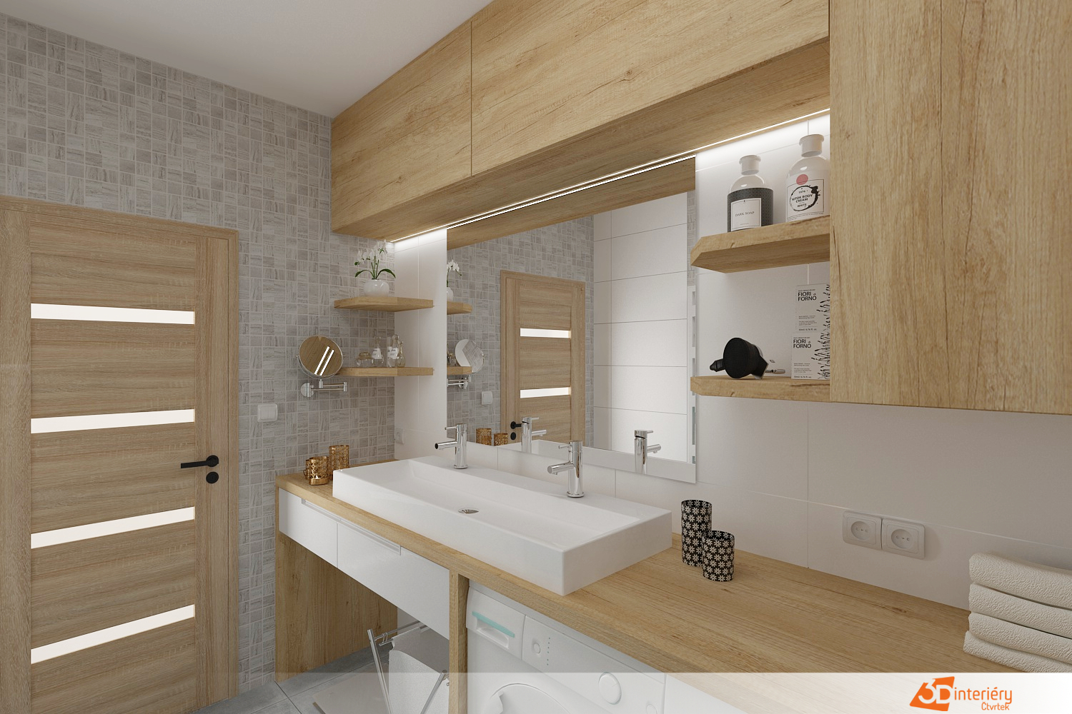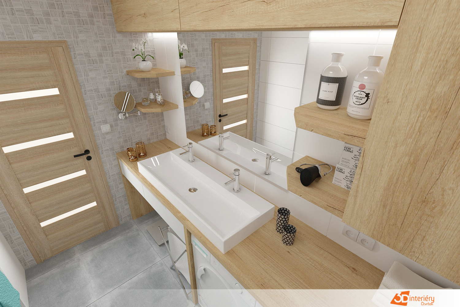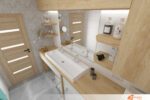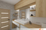 Kontrast a zároveň příjemné zateplení celému prostoru dodávají detaily ze dřeva – například deska pod umyvadlem, poličky nebo rámy zrcadla. Tyto prvky vnášejí do jinak minimalistického interiéru přírodní texturu a vizuální měkkost.