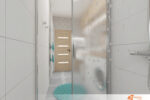 Koupelna laděná do bílé barvy působí čistě, vzdušně a nadčasově. Hlavním prvkem prostoru je elegantní sprchový kout s čirým sklem, který zajišťuje maximální otevřenost a plynulost prostoru. Všechny stěny i většina vybavení jsou v bílé barvě – umyvadlo, skříňky, i dlaždice, čímž vzniká světlé prostředí, které působí klidně a upraveně.