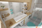 Tato koupelna spojuje funkčnost s jednoduchou estetikou. Bílá barva podporuje dojem čistoty, dřevo přidává teplo a modrý kobereček jemně oživuje celý prostor. Výsledek je harmonický, svěží a příjemně osobitý.