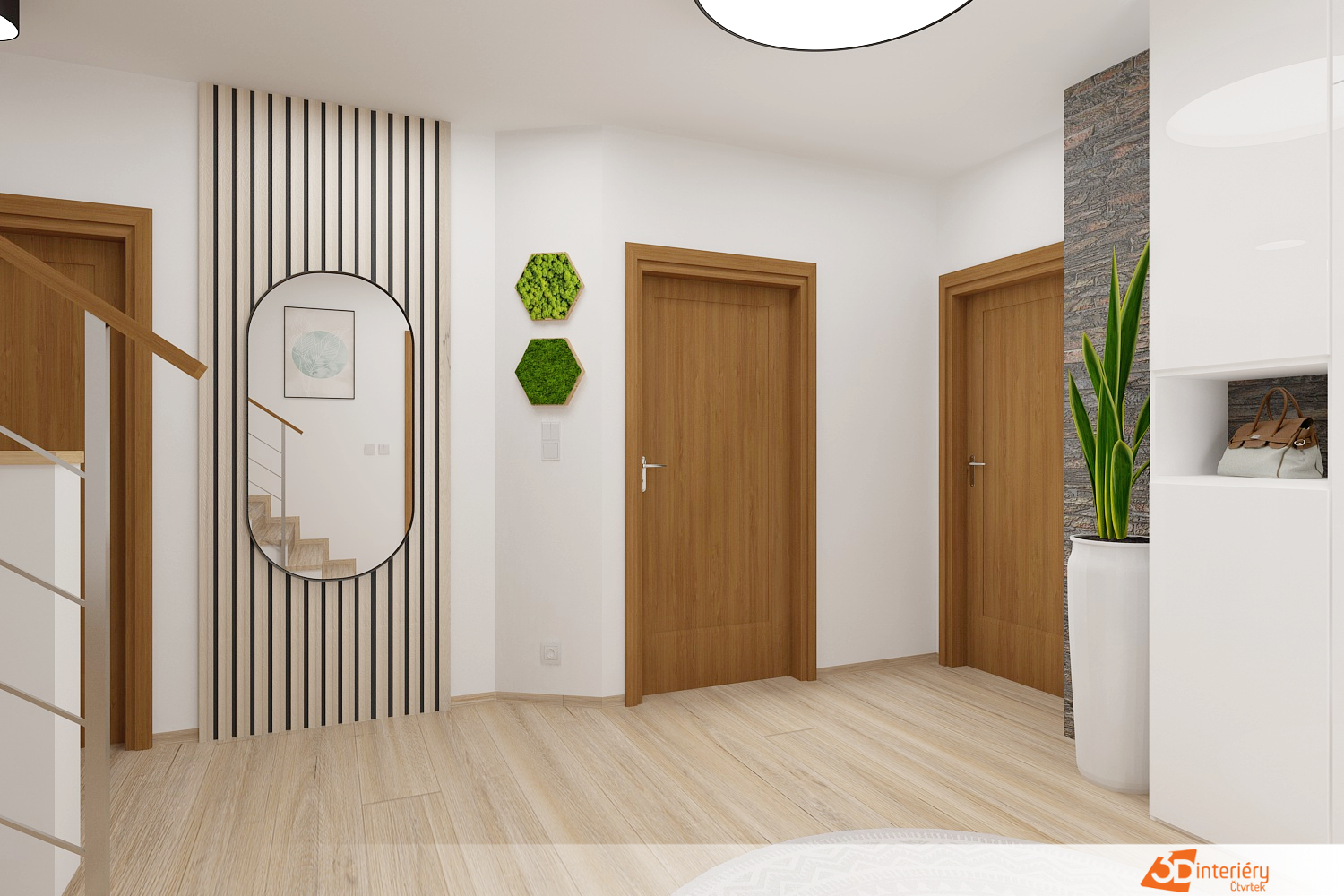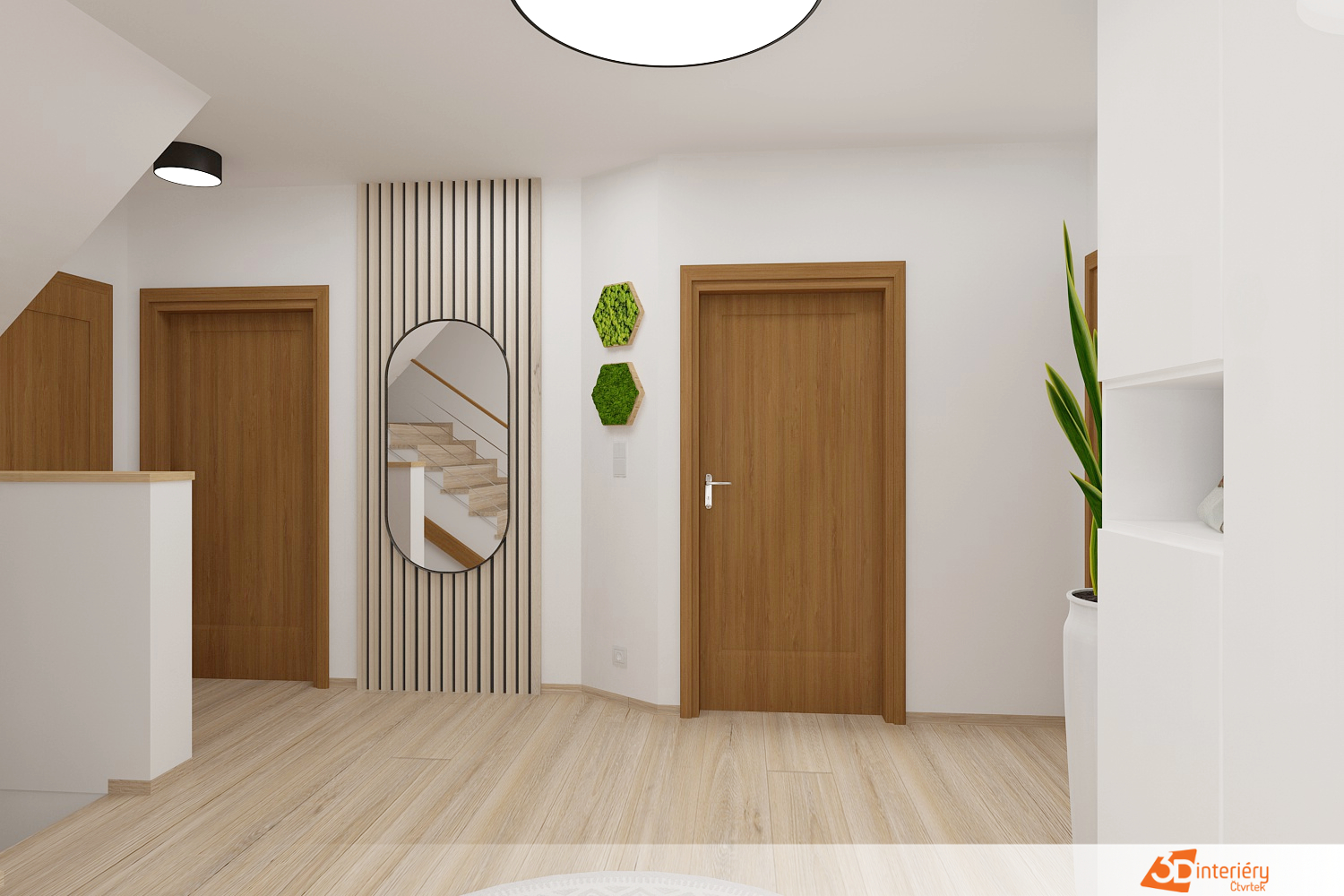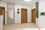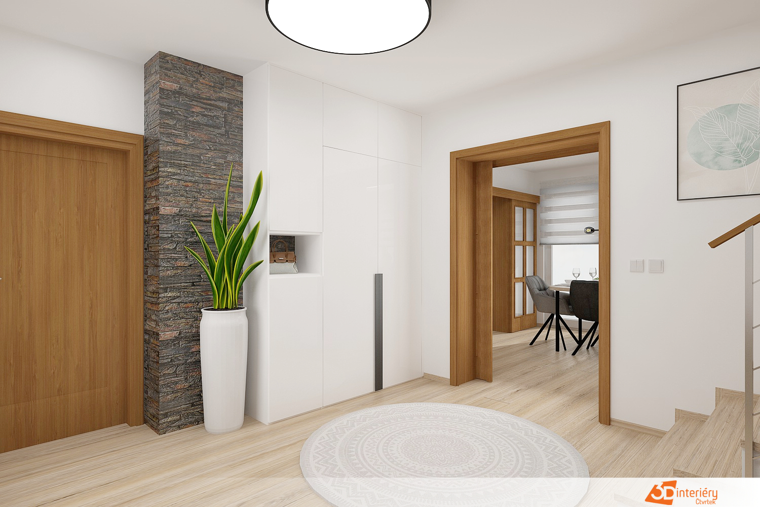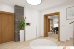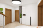 Předsíň působí vzdušně, svěže a elegantně díky bílým stěnám, které opticky zvětšují prostor a propouštějí do místnosti maximum světla. Centrálním prvkem je schodiště vedoucí do dalšího patra, které plynule propojuje úrovně domu a dodává prostoru dynamiku. Jeho umístění v předsíni přirozeně navádí pohyb a vytváří pocit otevřenosti.