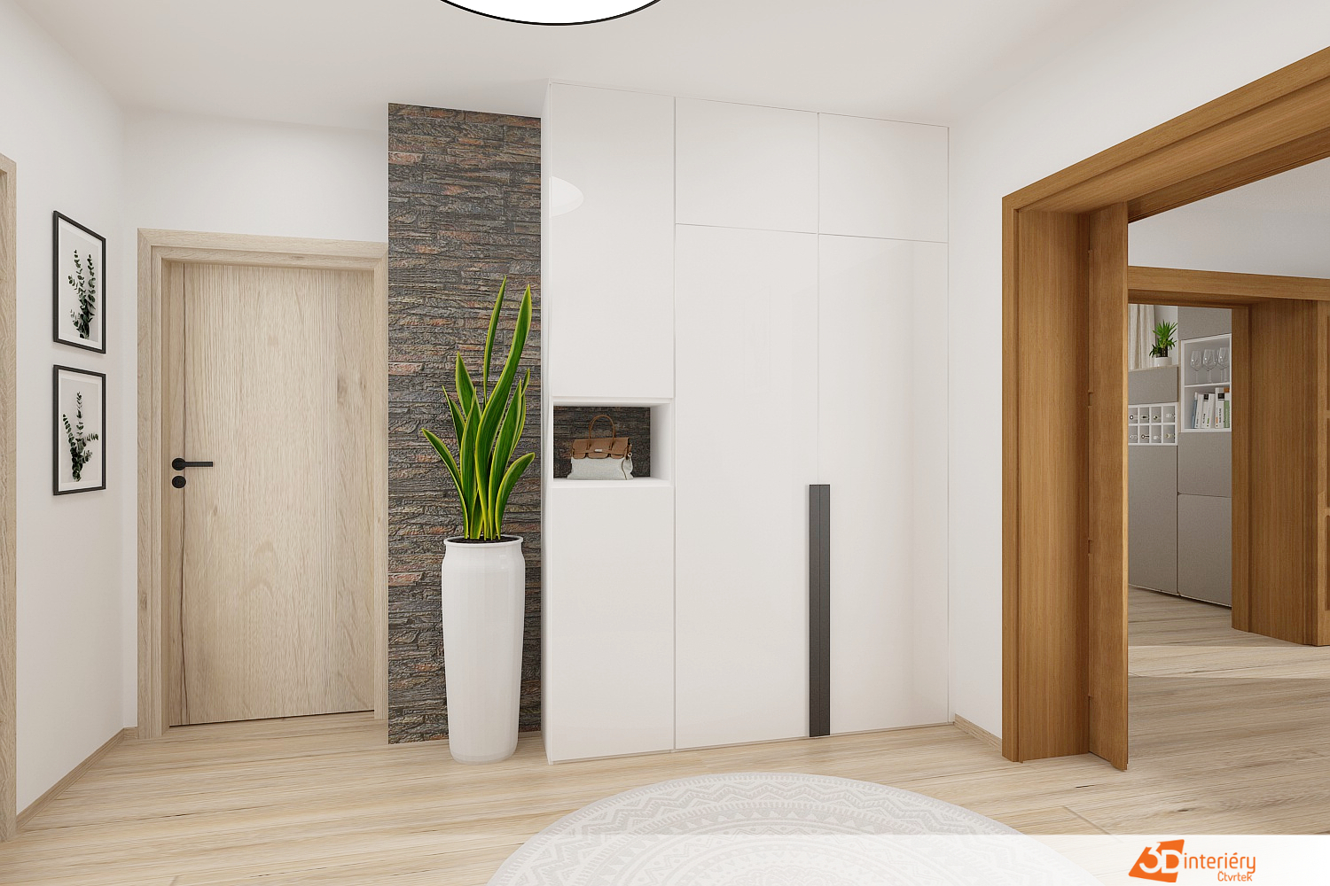 V rohu místnosti stojí vysoký květináč s rostlinou, která do předsíně přináší dotek přírody. Zelená barva listů příjemně kontrastuje s bílým pozadím a dodává prostoru svěžest a živost. Celkový dojem z předsíně je čistý, moderní a harmonický – ideální vstupní prostor do stylového domova.
