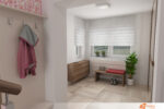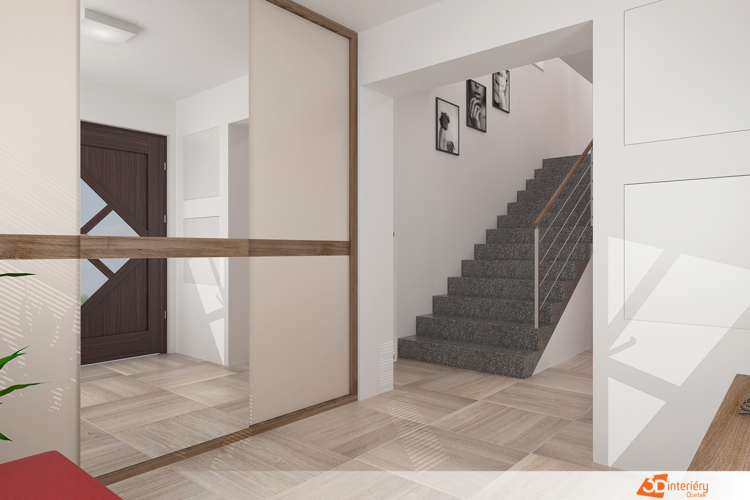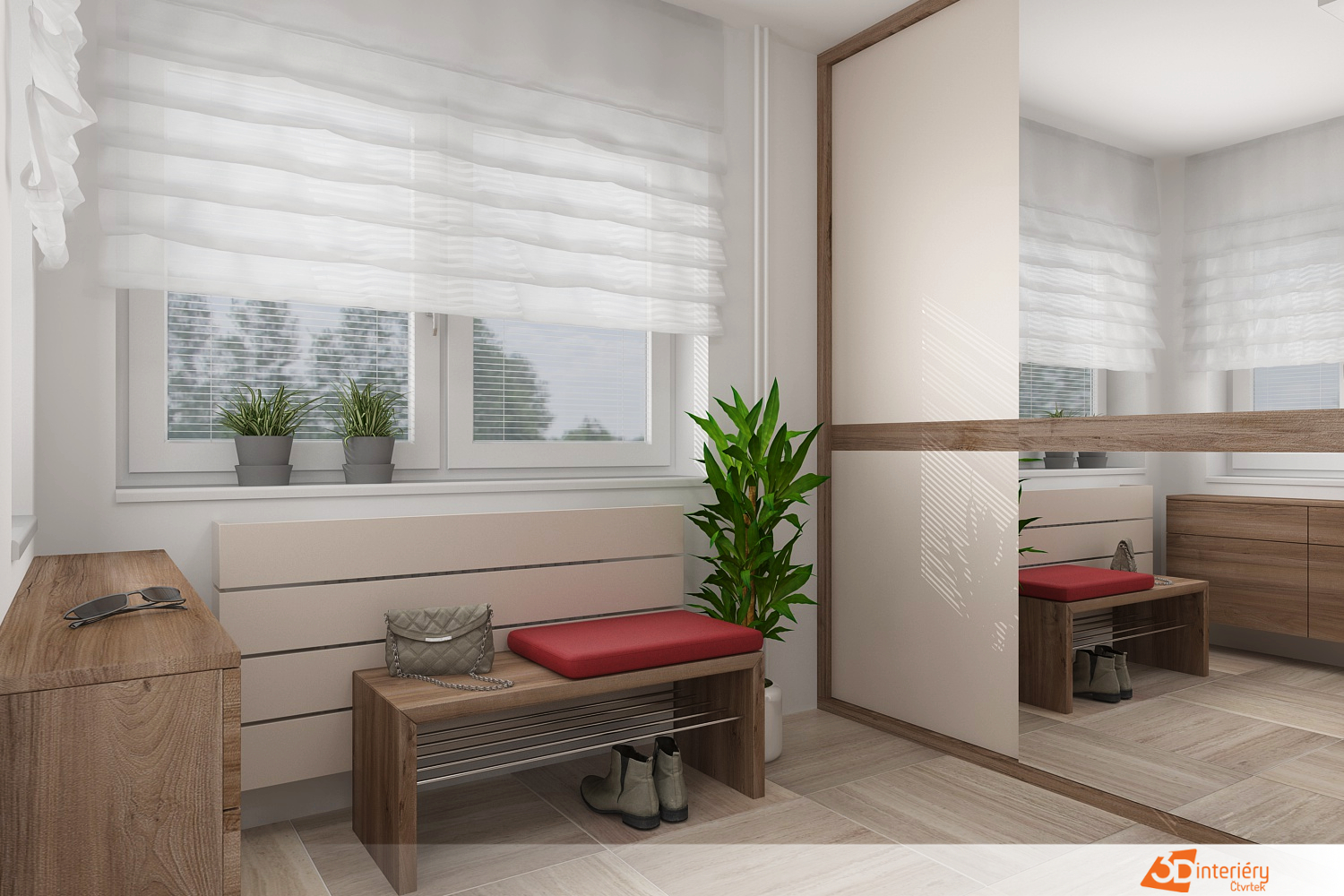 Při vstupu do místnosti upoutá pozornost velká skříň s hladkým povrchem a čistými liniemi. Její dominantou se stává rozměrné zrcadlo, které odráží světlo i barevnost tapety a opticky rozšiřuje celou chodbu. Rám skříně ladí s barvami interiéru a přispívá k celkovému modernímu dojmu.