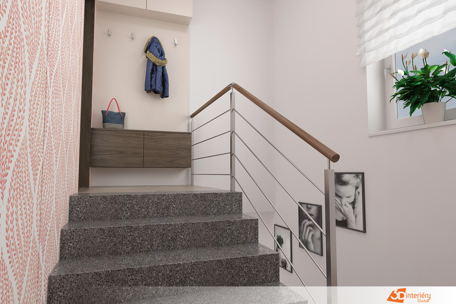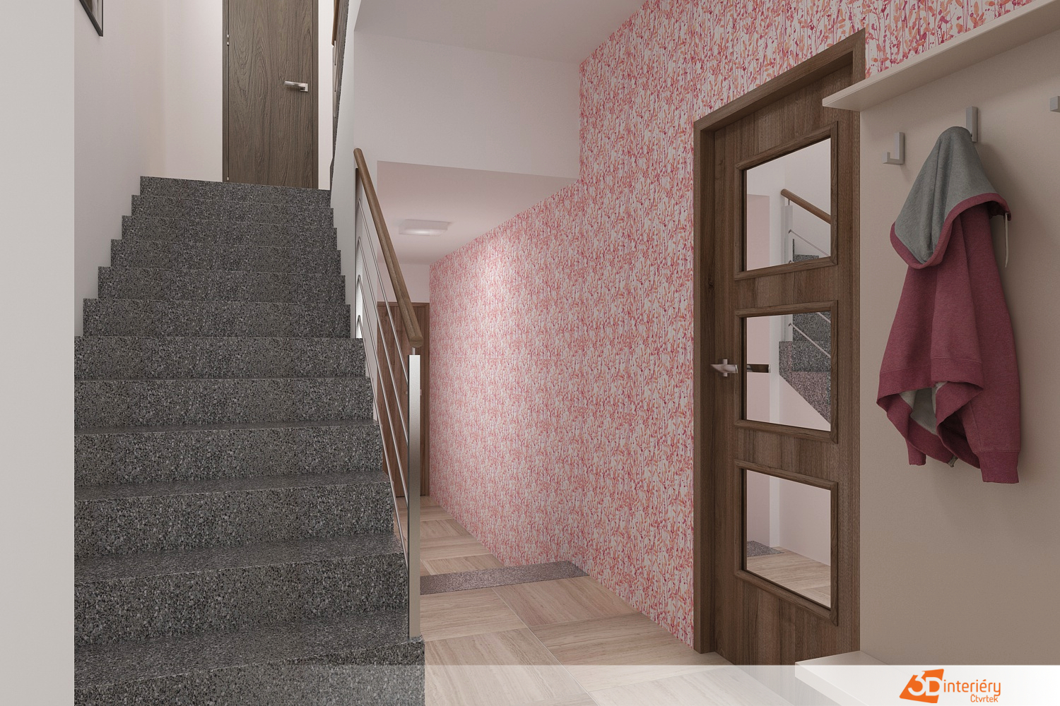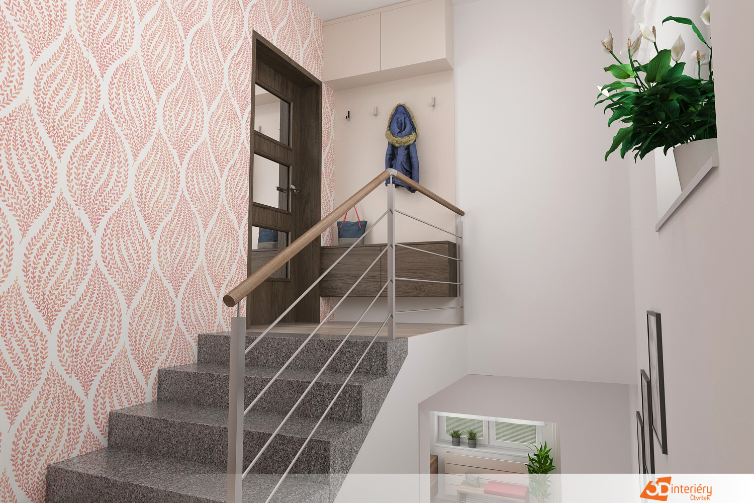 Podlaha nese neutrální tón, který propojuje všechny prvky a podtrhuje kontrast mezi šedou a růžovou. Prostor působí promyšleně, zároveň zůstává otevřený pro doplňky nebo sezónní změny. Růžová tapeta dodává chodbě osobitý charakter, zatímco schodiště a skříň vytvářejí pevnou funkční základnu.