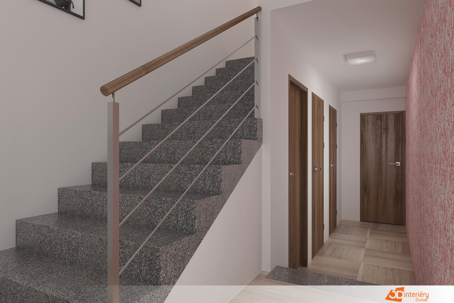 Chodba zaujme na první pohled díky výraznému kontrastu mezi masivním šedým schodištěm a moderní růžovou tapetou. Tapeta s jemným vzorem v růžových tónech přináší do prostoru hravost i eleganci, zatímco šedé schody působí stabilně, pevně a sebejistě. Tato kombinace vytváří neobvyklou, ale vyváženou atmosféru.