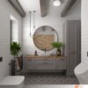 Podlaha a ostatní stěny se nesou v bílé barvě, která opticky zvětšuje prostor a udržuje světlý a vzdušný charakter. Umyvadlo s minimalistickým tvarem doplňuje tento harmonický prostor, zatímco zrcadlo nad ním odráží světlo a zvětšuje dojem otevřenosti.