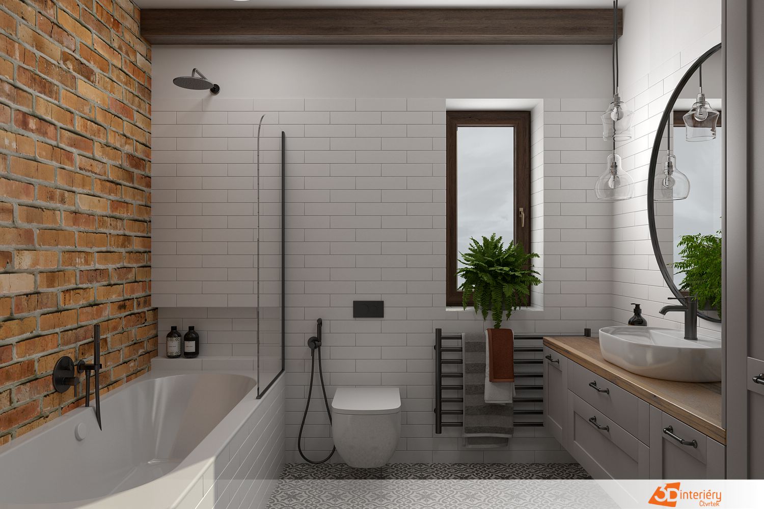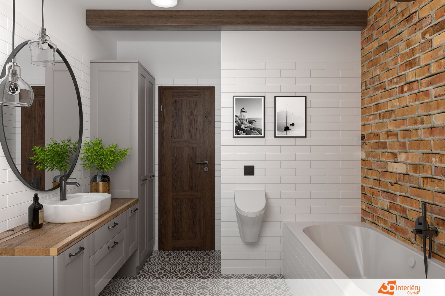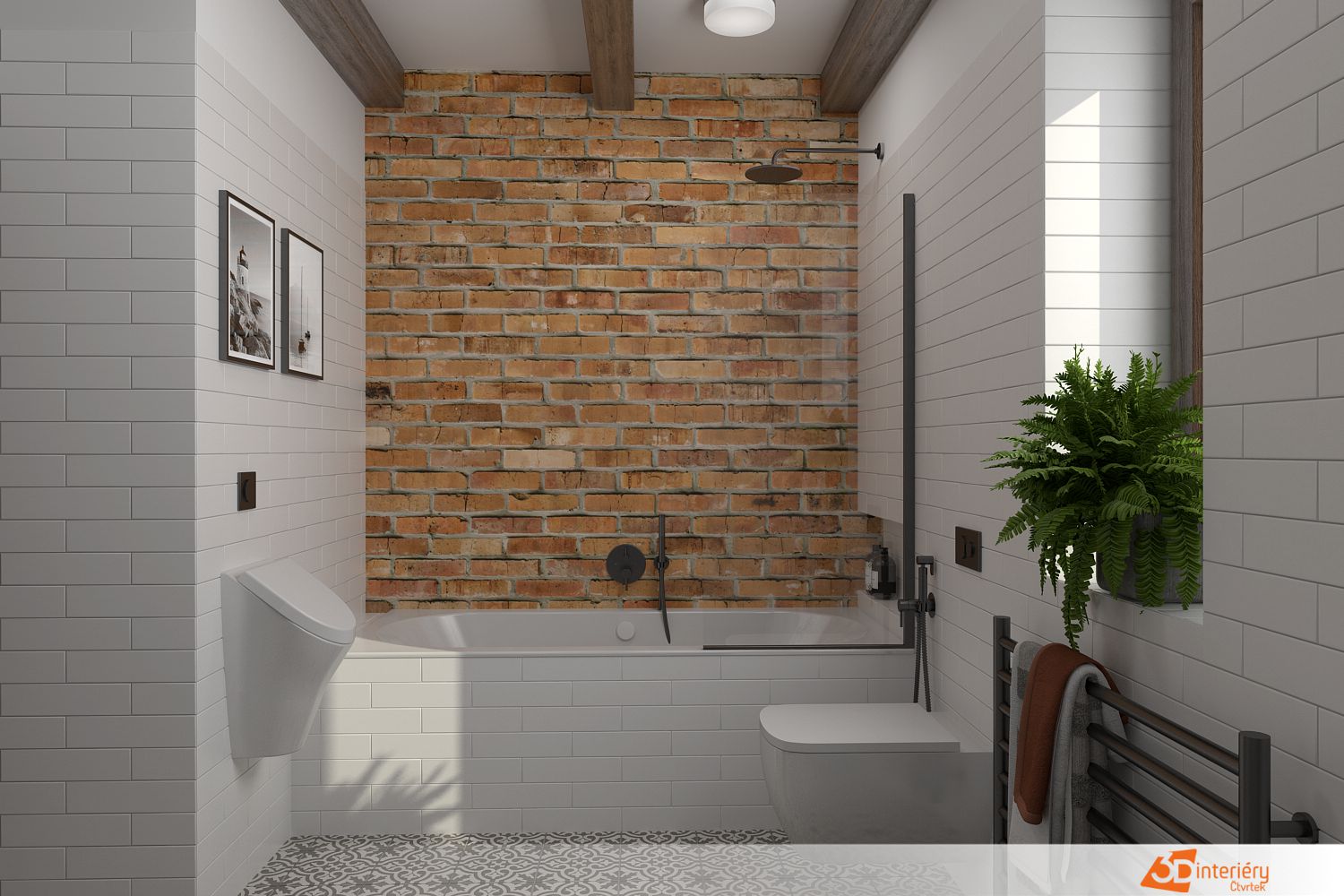 Koupelna v převážné bílé barvě působí svěže a prostorně. Za vanou zaujímá zeď s tapetou imitující cihly, která dodává prostoru nádech industriálního stylu a zároveň příjemný kontrast k hladkým bílým plochám. Tapeta s jemnou strukturou vytváří dojem hloubky a textury, aniž by působila rušivě.