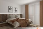 Postel stojí uprostřed této kompozice, čelo ladí s tmavým dřevem, a tím celek působí celistvě. Vedlejší stěny dostaly jemnější odstín hnědé, aby vynikl kontrast mezi jednotlivými materiály. Podlaha zůstává světlá, čímž vyvažuje hutnost zadní stěny.