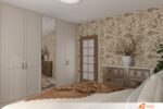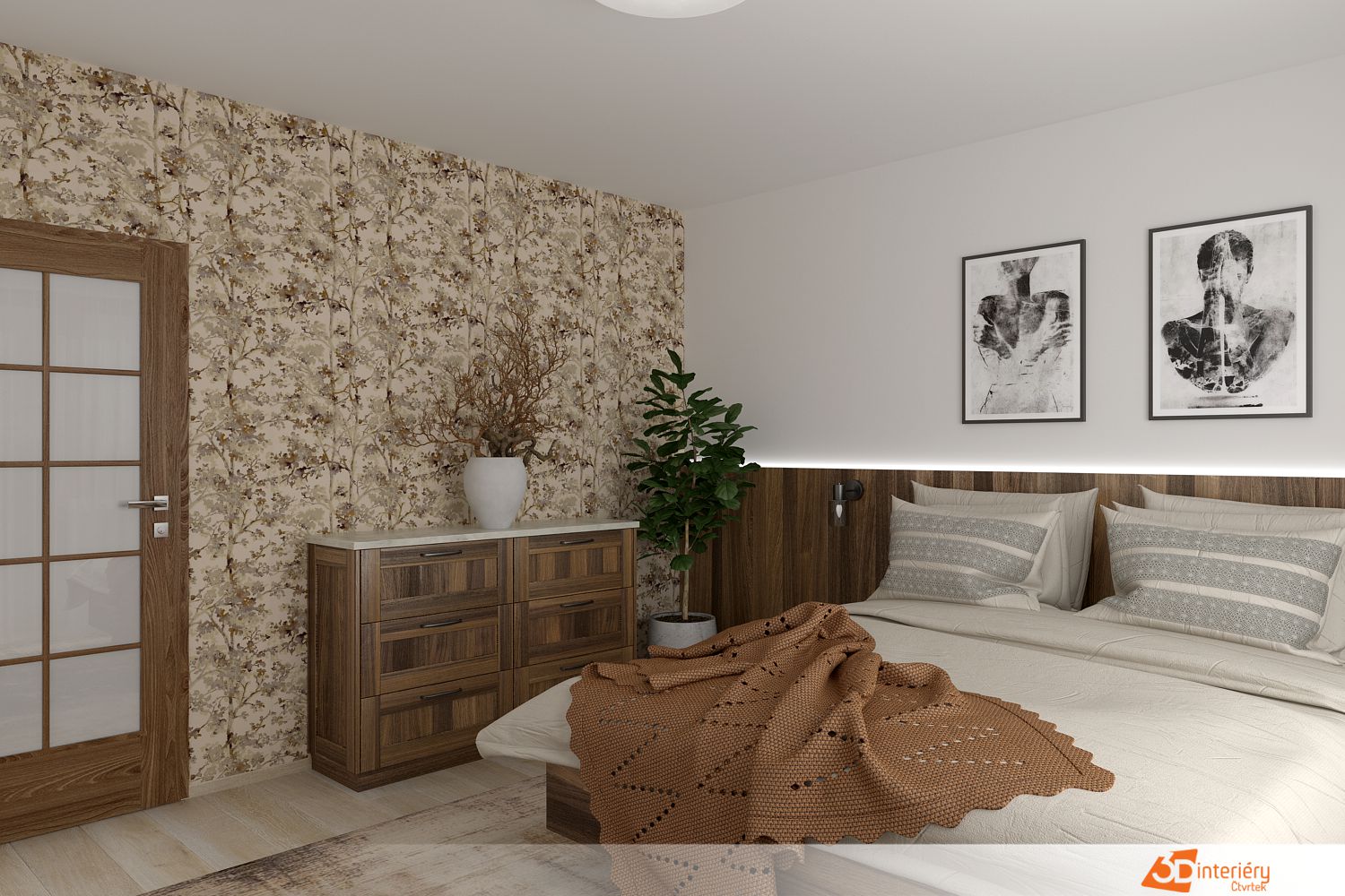 V rámci návrhu ložnice vznikl prostor, který spojuje eleganci, klid a výrazné přírodní prvky. Za postelí se nachází dřevěné obložení z tmavého dřeva, sahající do poloviny výšky stěny. Tento prvek dodává místnosti hloubku a pocit uzemnění. Nad dřevem navazuje tapeta s jemným květinovým motivem v hnědých tónech. Květiny působí nenápadně, přesto přitahují pozornost svou strukturou a barevnou harmonií.