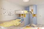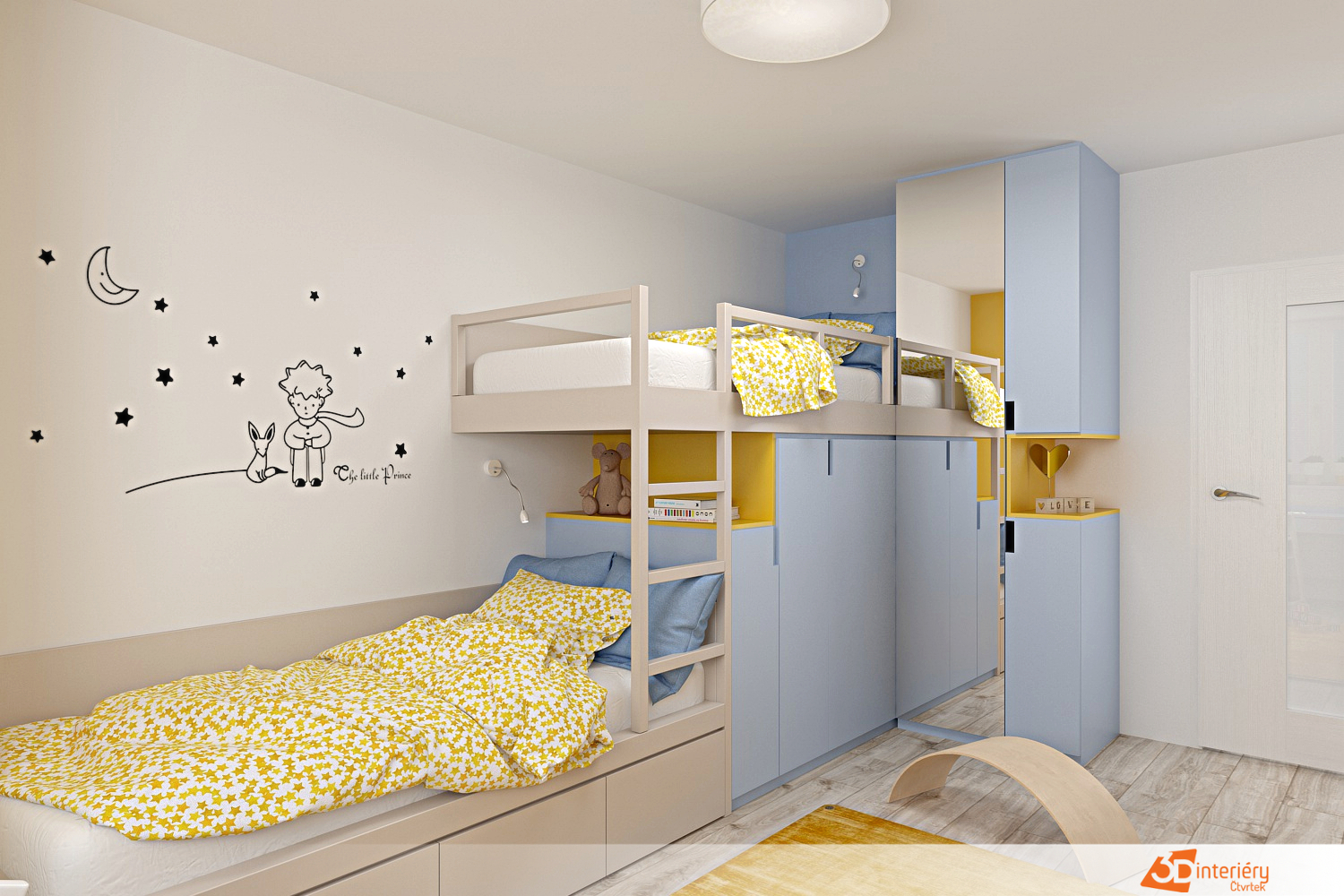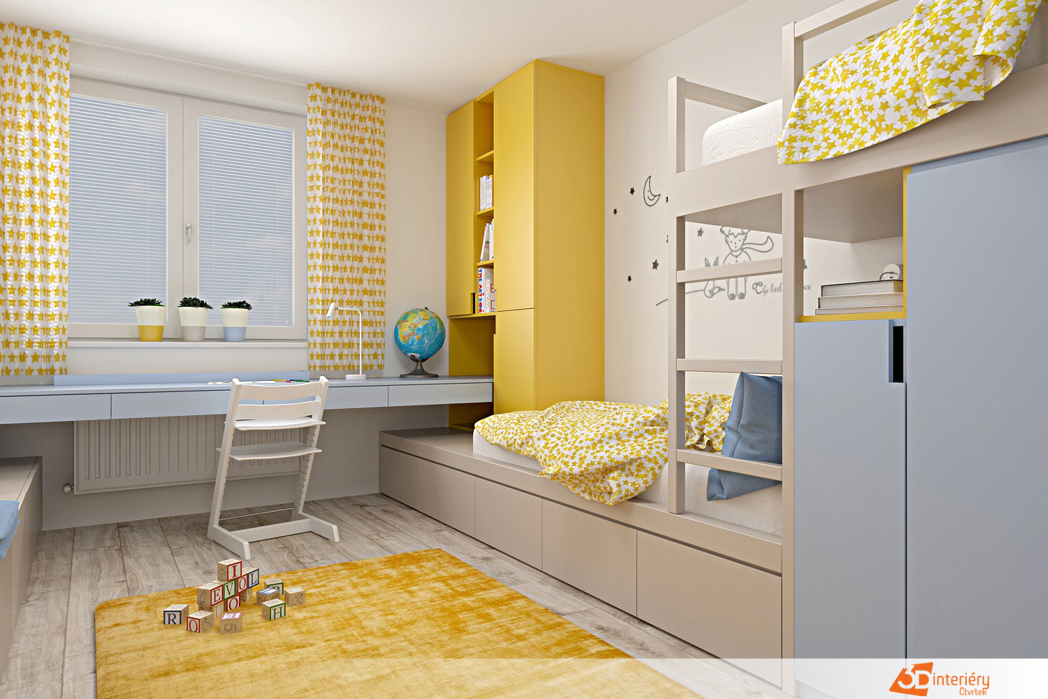 Dětský pokoj laděný do žlutých tónů působí jako teplý, radostný svět, kde fantazie dostává volnost. Sluneční světlo prochází světlými závěsy a odráží se od žlutých stěn, které celý prostor prozáří. Na jedné z bílých stěn se nachází tapeta s jemným, poetickým motivem – sedící chlapec vedle lišky, oba obráceni k obloze. Kolem nich se vznášejí hvězdy, které vytvářejí dojem nočního ticha a přemýšlení.