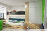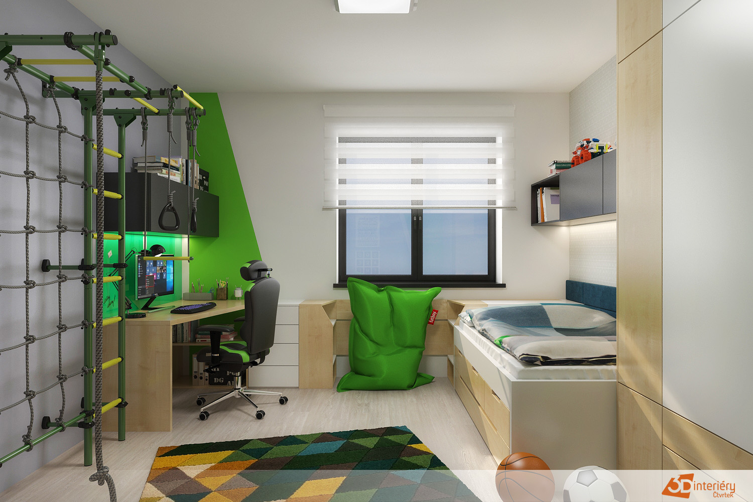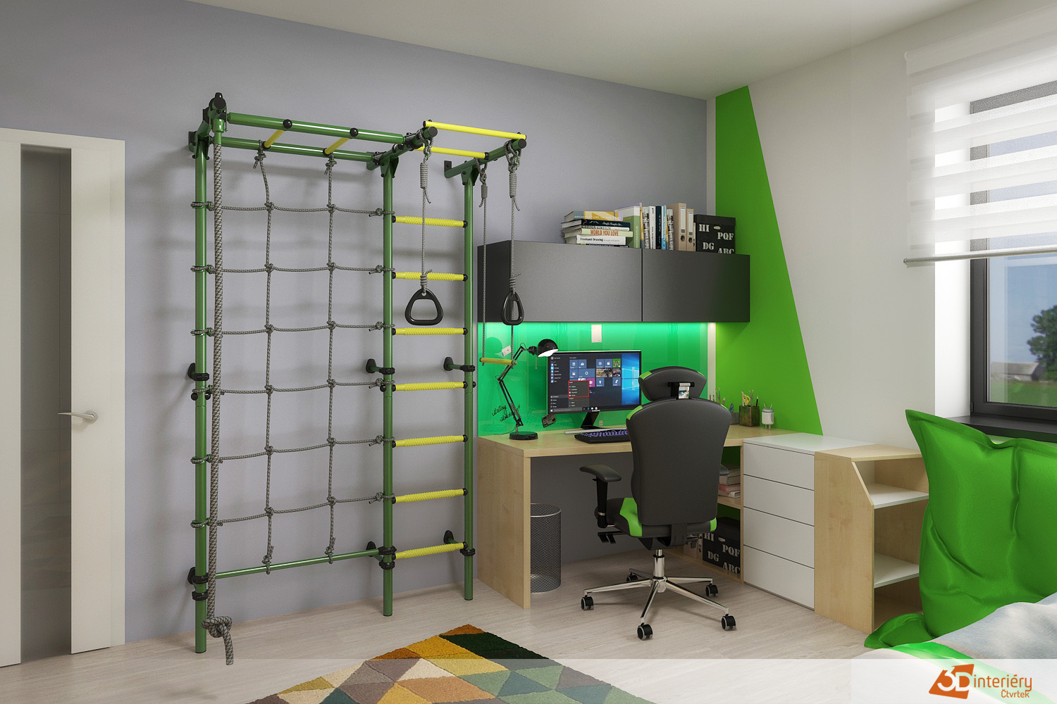 Pokoj plný energie a hravosti zaujme hned na první pohled výraznými zelenými prvky. Zeleň prostupuje celým prostorem – od rámů prolézaček až po úložné boxy a části nábytku. Dvě prolézačky vedle sebe tvoří hlavní hrací zónu. Jedna nabízí šplhací síť, druhá láká klouzačkou a malým tunelem. Děti mezi nimi přebíhají, lezou, skáčou a vymýšlejí nové hry.