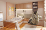 Zdi zdobí jednoduché poličky z hladce broušeného dřeva. Zespodu je lemuje bílé světlo, které vrhá jemnou záři na stěnu i věci položené pod nimi. Knihy, svíčky a malé rostliny na policích vytvářejí rovnováhu mezi praktičností a estetikou. Celý prostor působí promyšleně a klidně, bez zbytečností. Večer se osvětlení mění v měkké pozadí, které podporuje odpočinek.