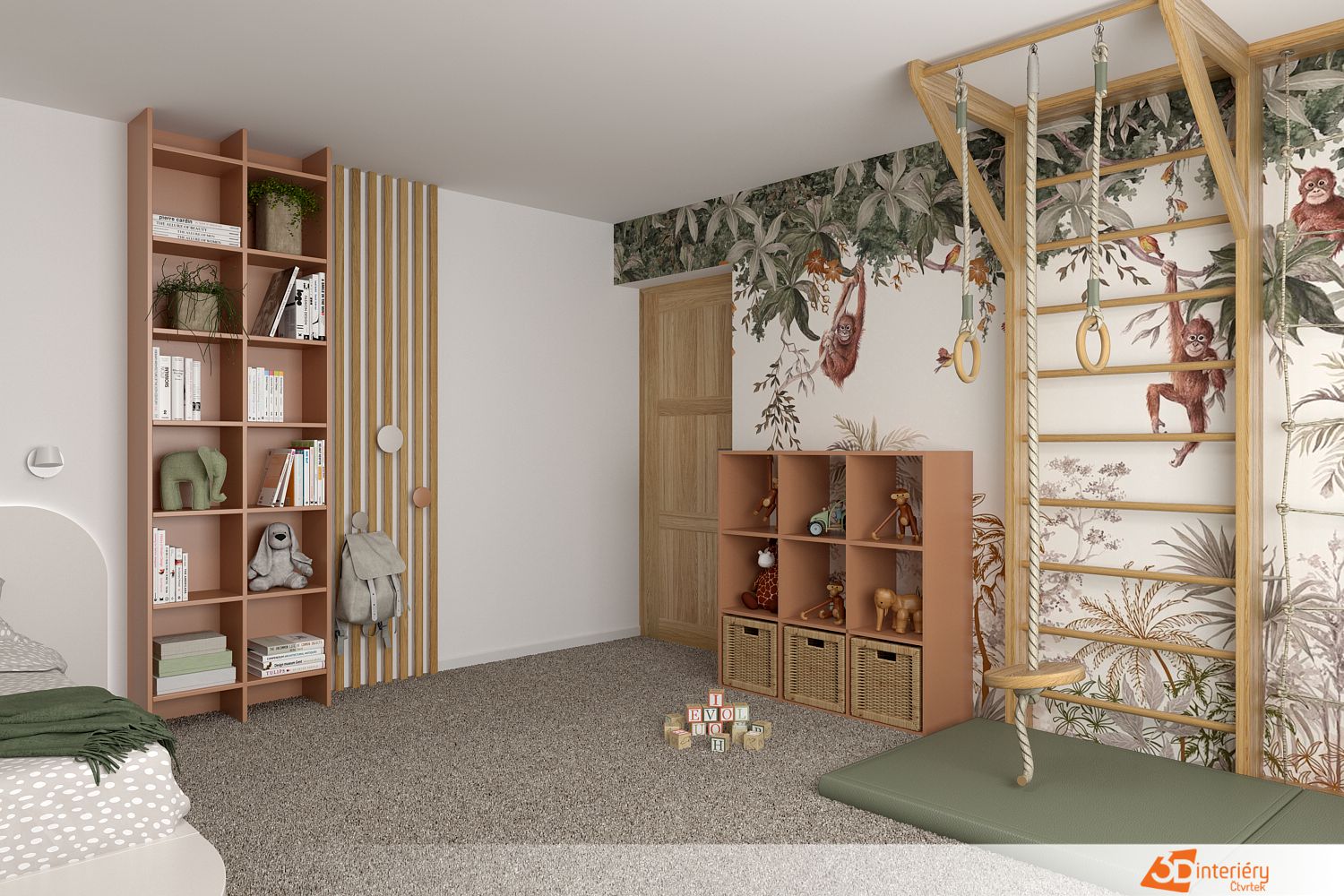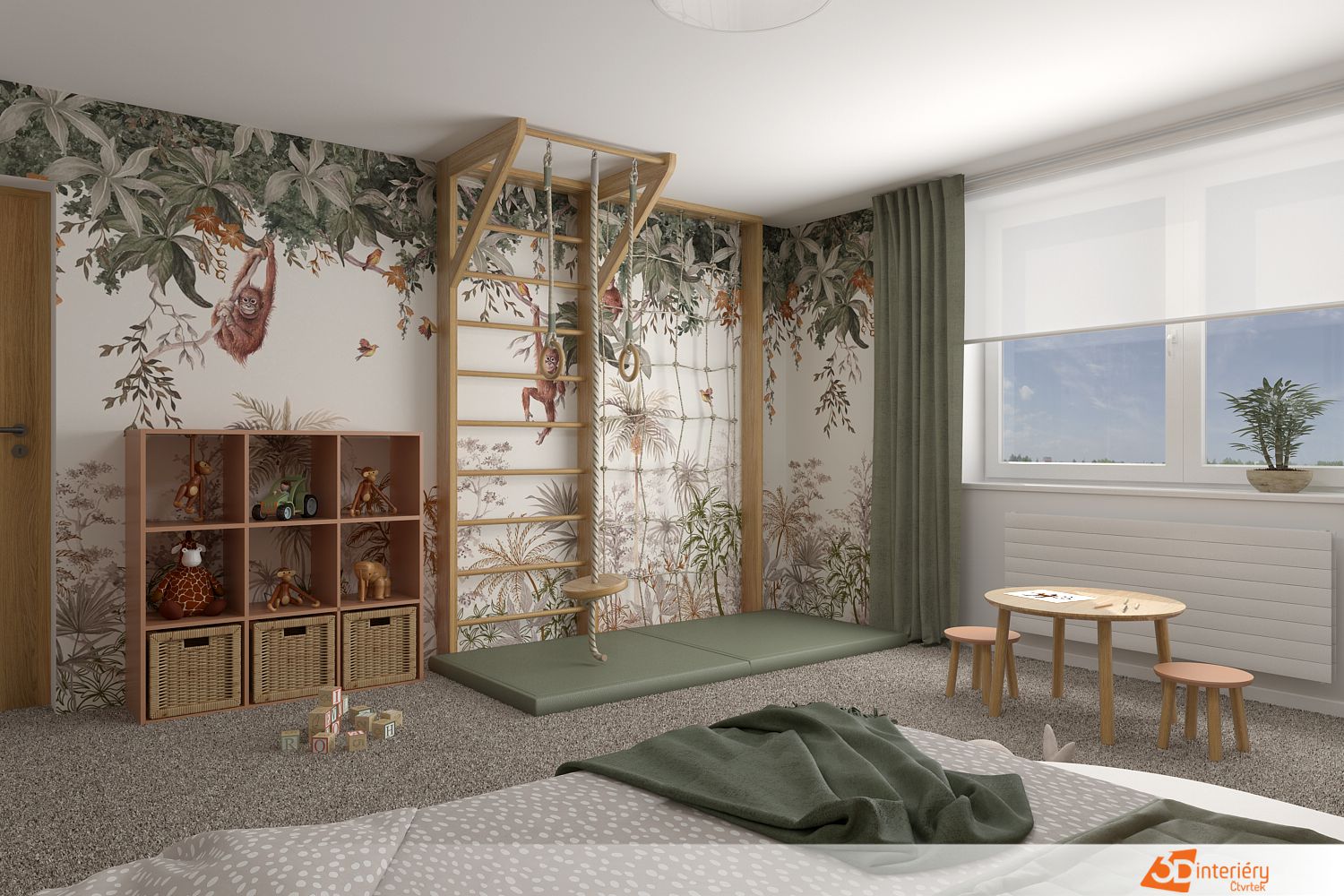 Dětský pokoj plný dobrodružství přitahuje pozornost jednou výraznou stěnou. Celou její plochu pokrývá tapeta s motivem džungle – palmy, liány a velký oranžový orangutan, který sleduje dění v místnosti z větve uprostřed. Atmosféra připomíná tropický prales těsně po dešti. Na této zdi pevně drží dřevěné žebřiny, které často slouží k lezení, houpání nebo zavěšení deky při stavbě bunkru.