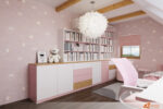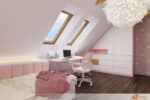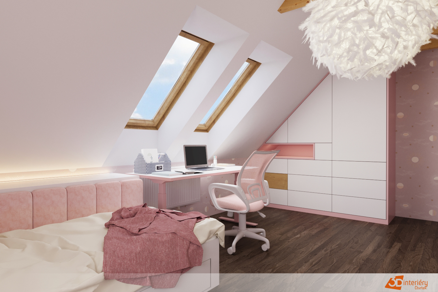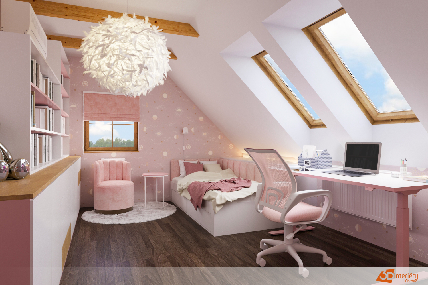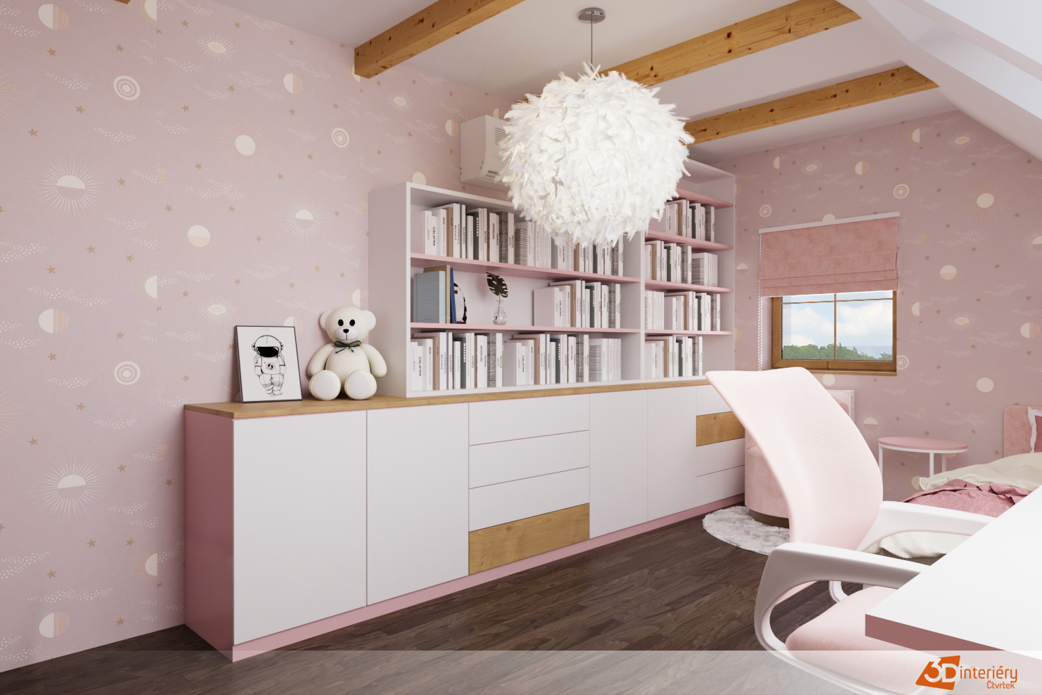 Postel s měkkým čelem stojí u jedné ze stěn a nese polštáře, přehozy a plyšové doplňky v tónech růžové, bílé a béžové. U okna se nachází psací stůl s praktickými organizéry, zrcadlem a lampičkou, kde vznikají kresby, úkoly i první deníkové zápisky.