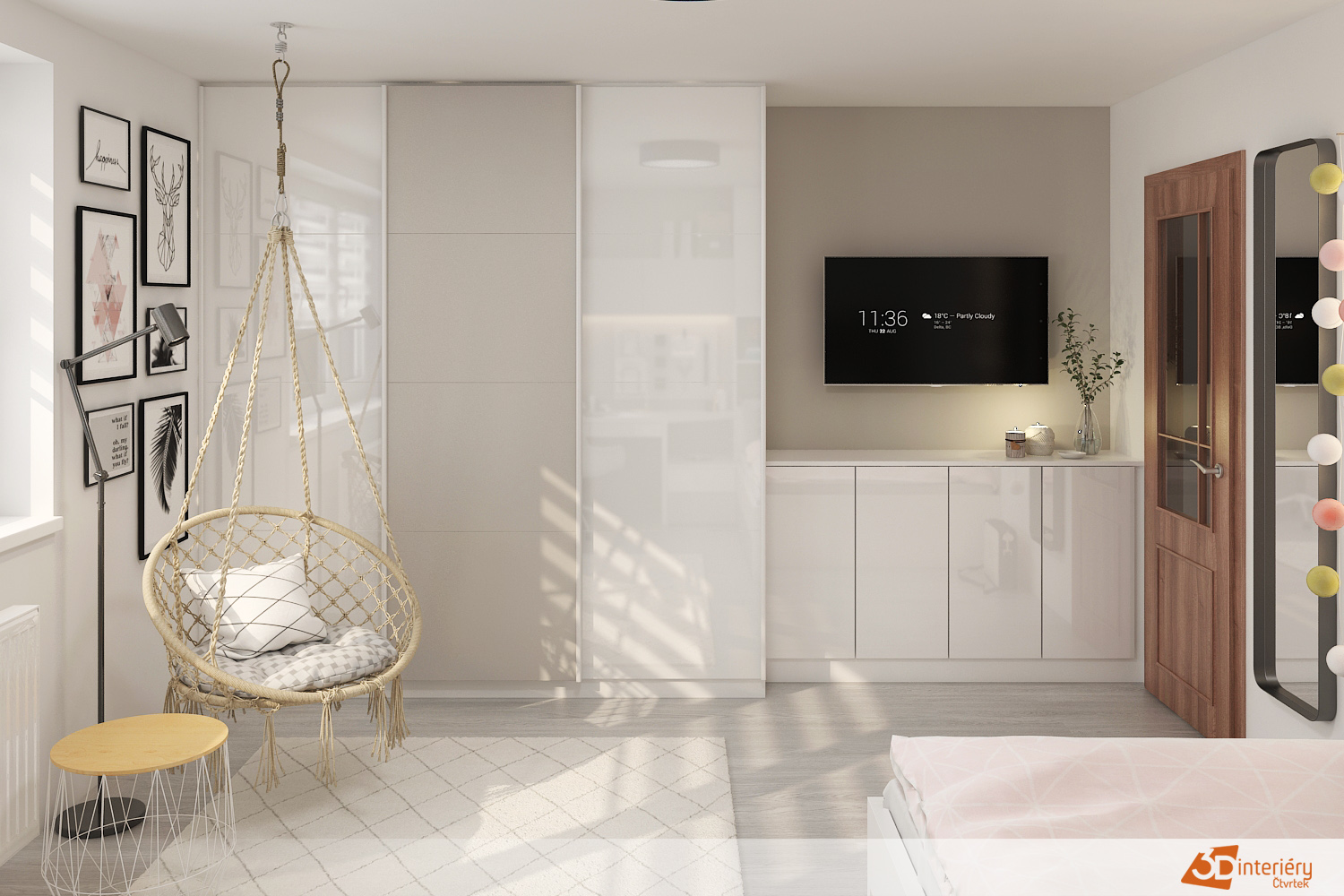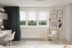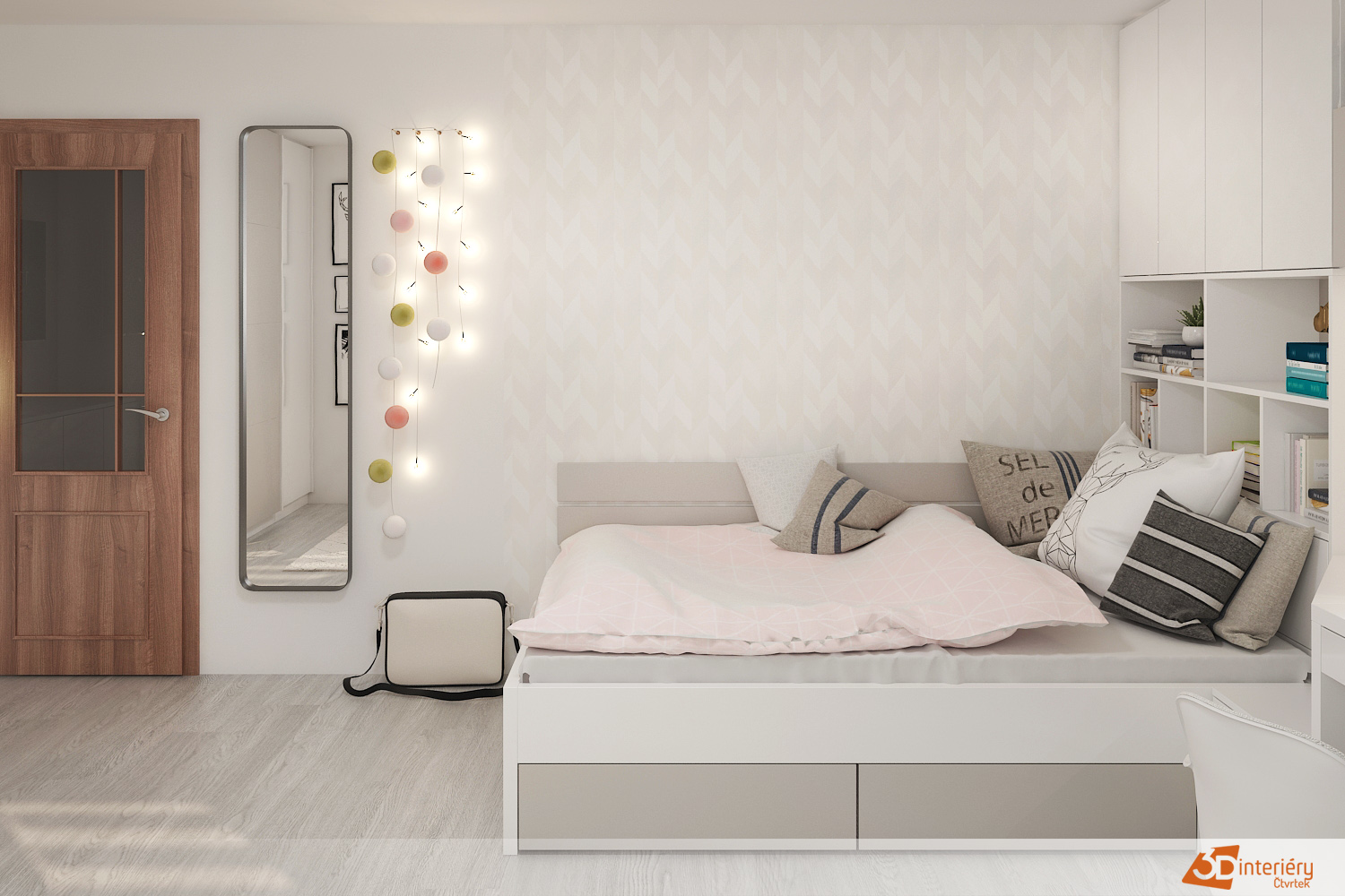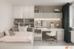 Postel stojí podél stěny, vedle ní se nachází psací stůl se zásuvkami a drobnými doplňky. Vše působí uspořádaně a vzdušně. Stůl slouží nejen k učení, ale i ke kreslení nebo skládání skládaček. Nad ním visí poličky s knihami a drobnými dekoracemi, které dodávají prostoru osobitost.