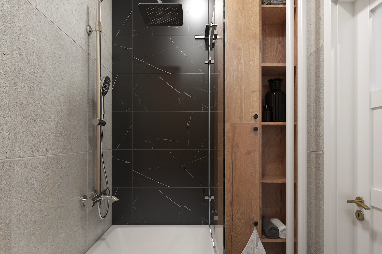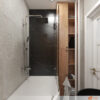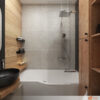 Podlaha nese stopy vody, která zanechává jemné mapy. Vana stojí u stěny, její tvar ladí s klidem prostoru. Voda v ní zrcadlí světlo z okna i tlumené odlesky ze stěn. Povrch hladký, linie čisté, ticho doprovází každý pohyb.