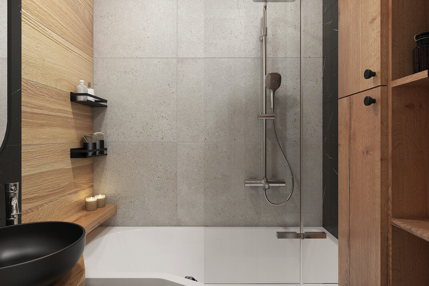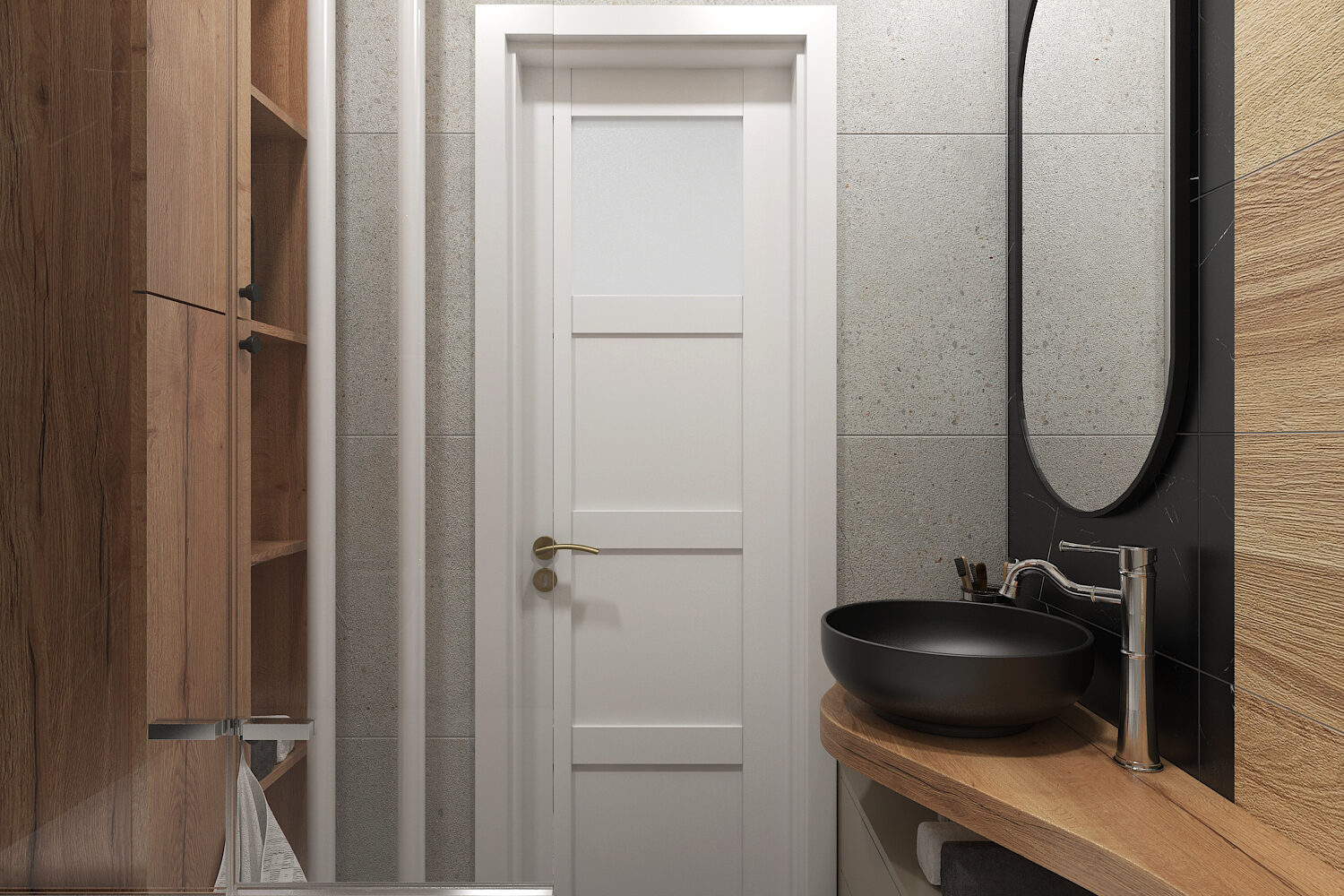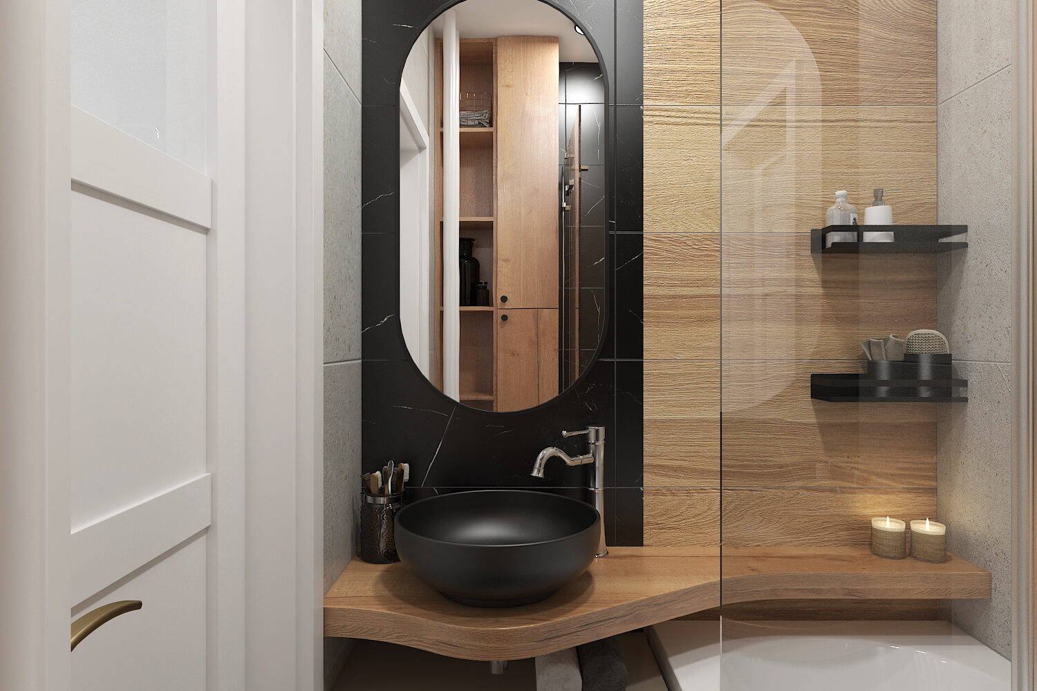 Moderní černé umyvadlo přitahuje pohled hned při vstupu. Matný povrch pohlcuje světlo, tvar pevný, současný, bez zbytečných detailů. Nad ním visí velké oválné zrcadlo s tenkým rámem, které odráží celý prostor. V zrcadle mizí hranice mezi stěnami, pohyby i časem.