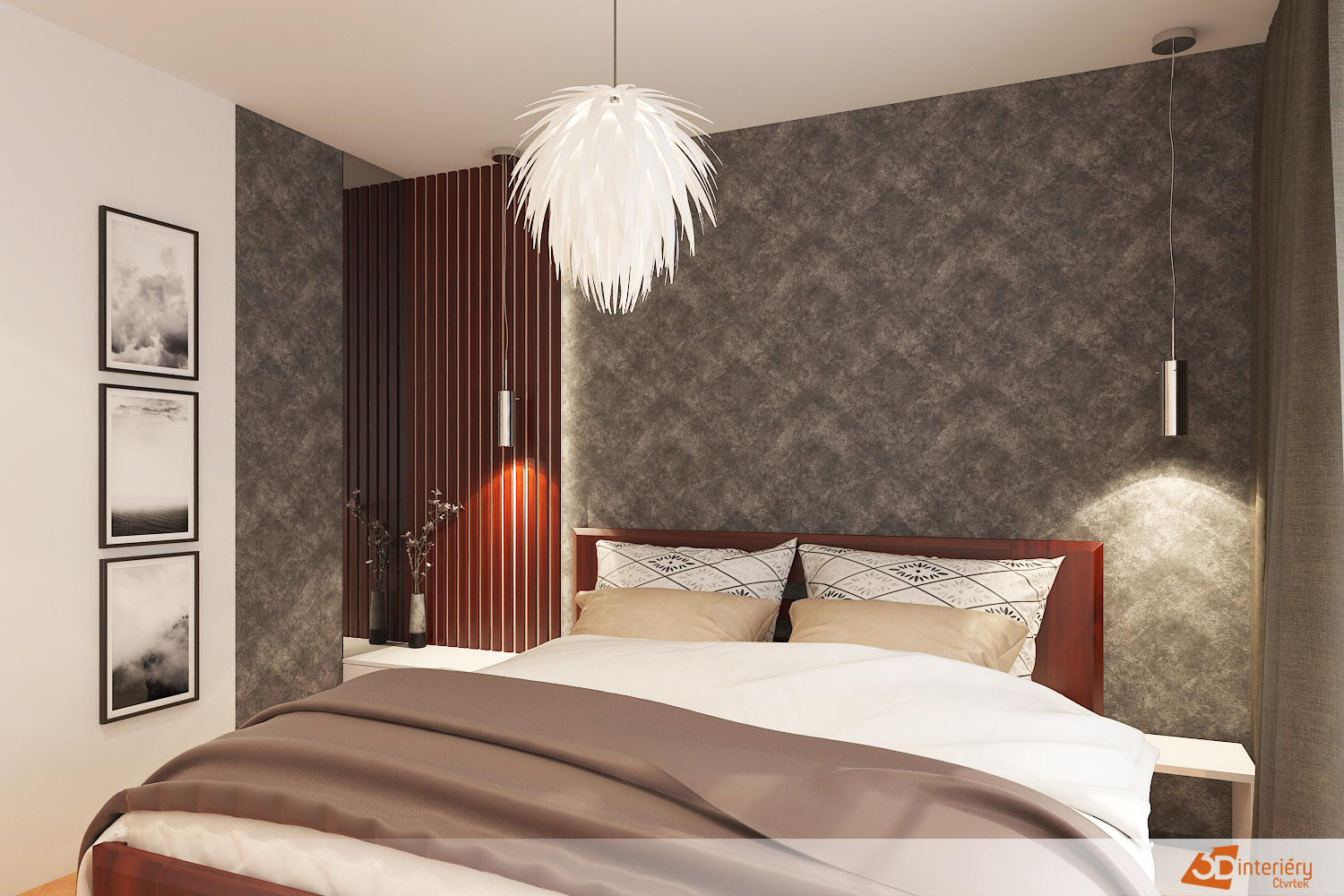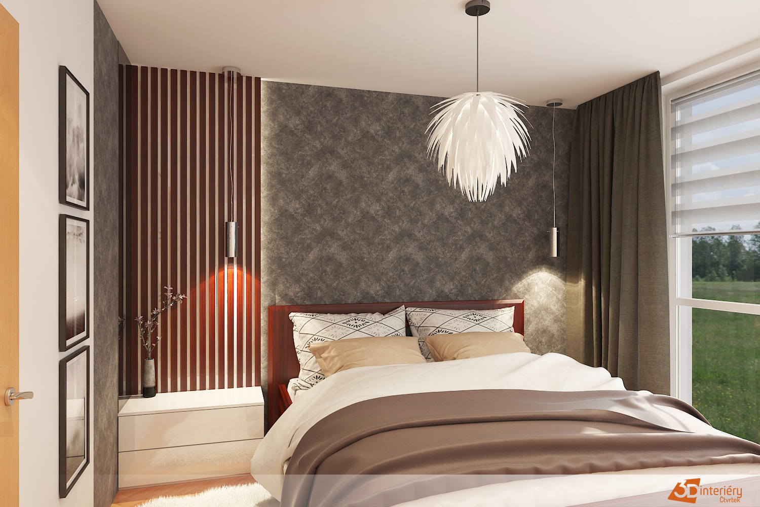 Ložnice působí jako klidné útočiště s důrazem na styl a detail. Dominantní stěna zaujme už na první pohled – zhruba tři čtvrtiny její plochy pokrývá elegantní tapeta s jemným vzorem, který ladí s celkovou atmosférou místnosti. Zbytek stěny zdobí svislé dřevěné pruhy, mezi nimiž prosvítá decentní světlo. Pod touto působivou stěnou leží pohodlné letiště s měkkými textiliemi a důrazem na komfort.