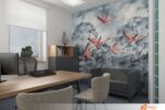 Uprostřed této tlumené palety se na jedné stěně objevuje odvážný kontrast: výrazná tapeta s motivem růžových ptáků ve vzduchu. Tento detail přitahuje pozornost a přináší do prostoru překvapivou hravost. Ptáci, jakoby právě přistáli uprostřed městské džungle, vytvářejí atmosféru svěžesti a inspirace.