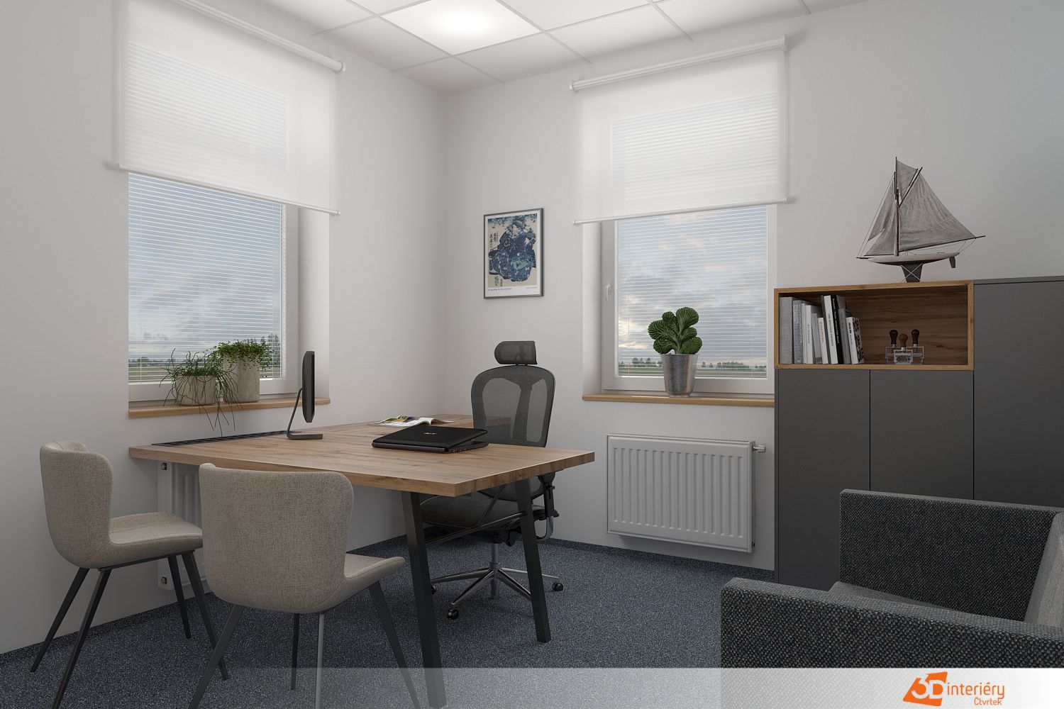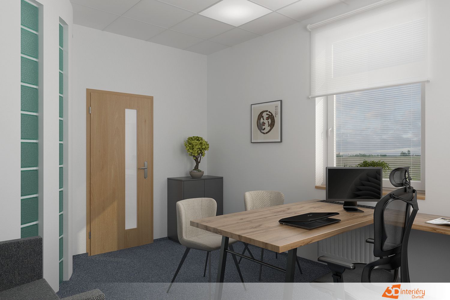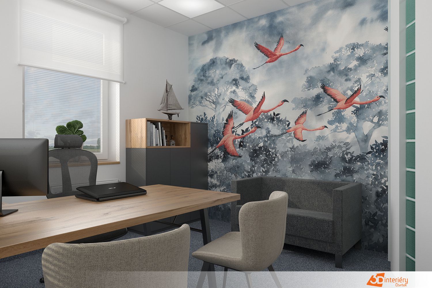 Světlo pronikající skrz velká okna zvýrazňuje texturu tapety a jemně oživuje jinak klidný interiér. Kancelář působí jako místo, kde se rodí nápady a kde každý detail podporuje soustředění i kreativitu.