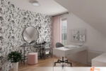 Moderní holčičí pokoj zaujme hned při vstupu svou elegancí a smyslem pro detail. Jedna ze stěn nese výraznou černobílou tapetu s geometrickým vzorem, který dodává prostoru šmrnc a hloubku. Vzory na tapetě vytvářejí dojem pohybu, přitom nepůsobí rušivě. Dlouhé závěsy v pastelově růžové barvě sahají až na zem a zjemňují celkový vzhled místnosti.