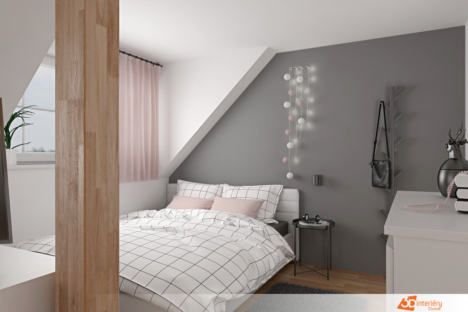 Postel se nachází u boční stěny, podél níž vede světelný řetěz s malými pastelovými světýlky. Na podlaze leží měkký koberec v jemně šedé barvě, ideální pro ranní bosé kroky. Psací stůl u okna nabízí dostatek světla i prostoru pro kreslení nebo učení.