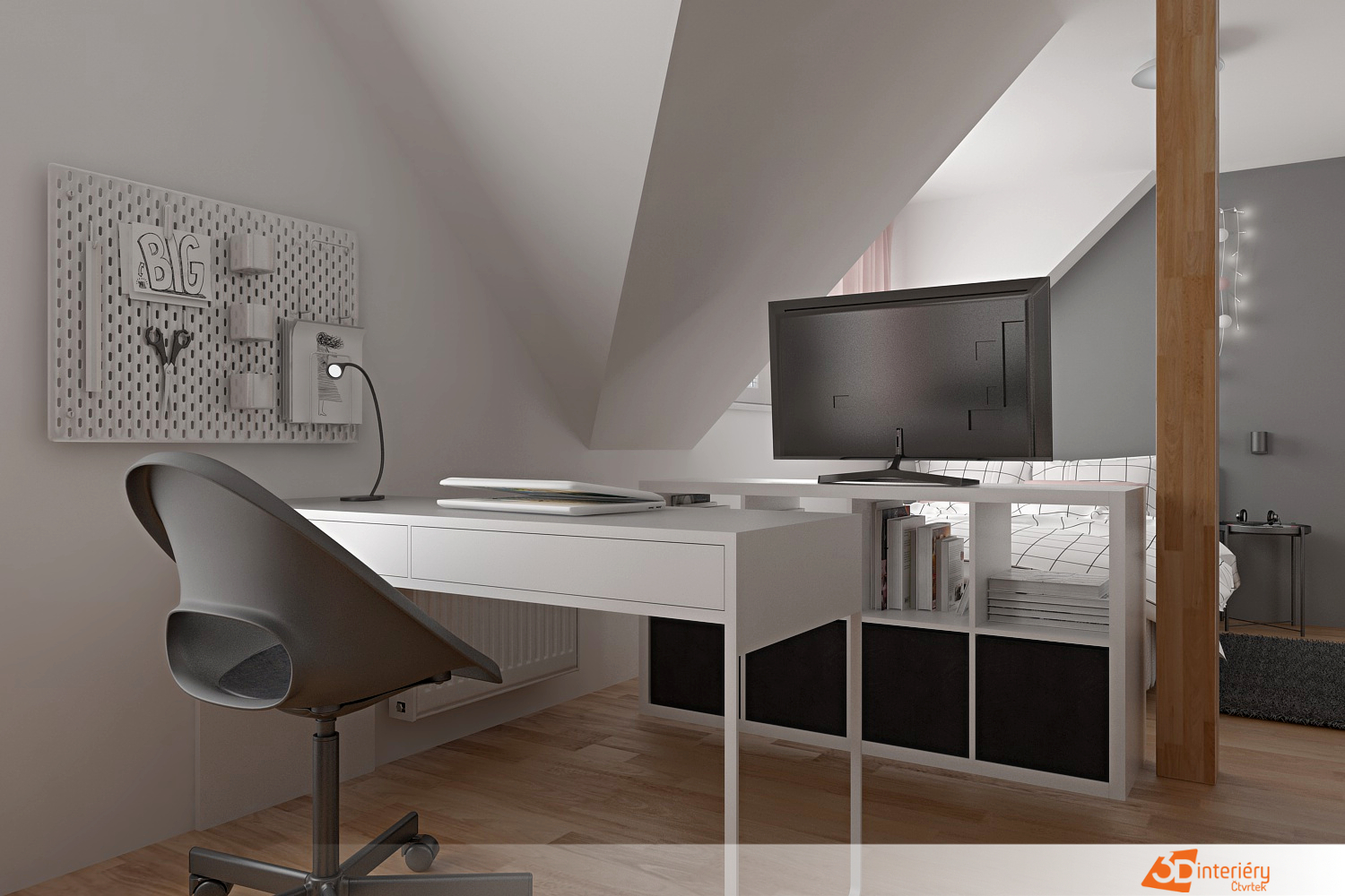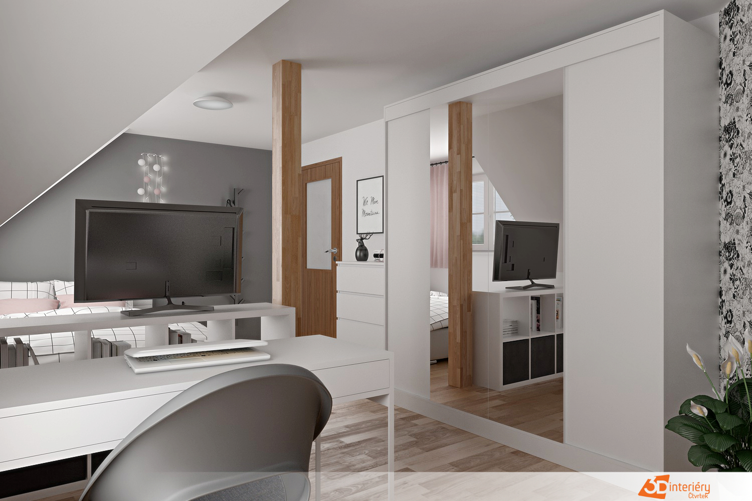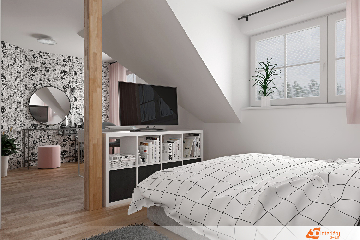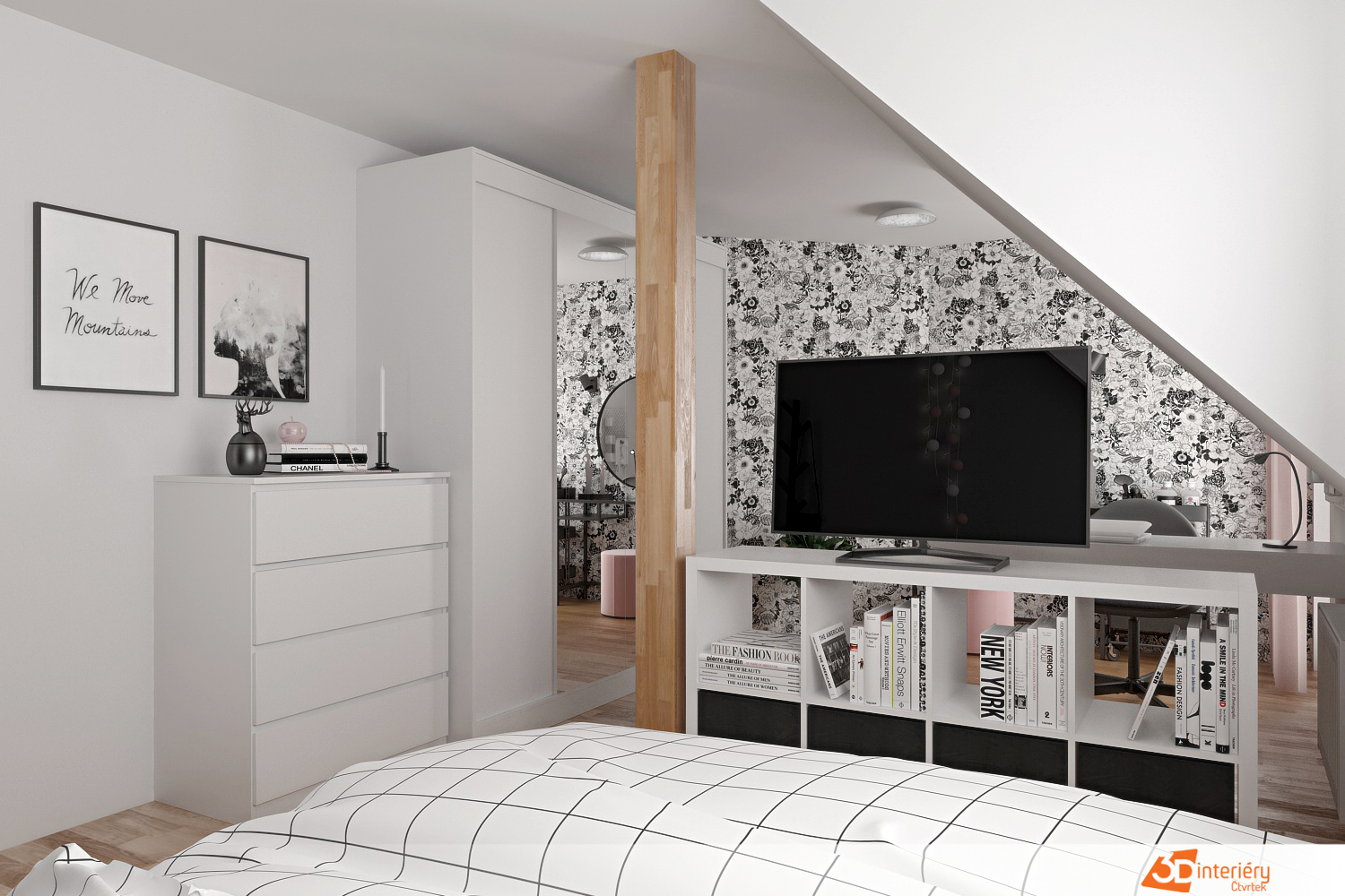 Prostor laděný do odstínů šedé, bílé a růžové působí harmonicky a uklidňujícím dojmem. Každý prvek nese svůj účel i styl – od polštářků na posteli až po detaily na úložných boxech. Naproti posteli se nachází moderní televize, umístěná na nízké bílé komodě s hladkým povrchem. Večer slouží k relaxaci, ráno k poslechu oblíbené hudby.