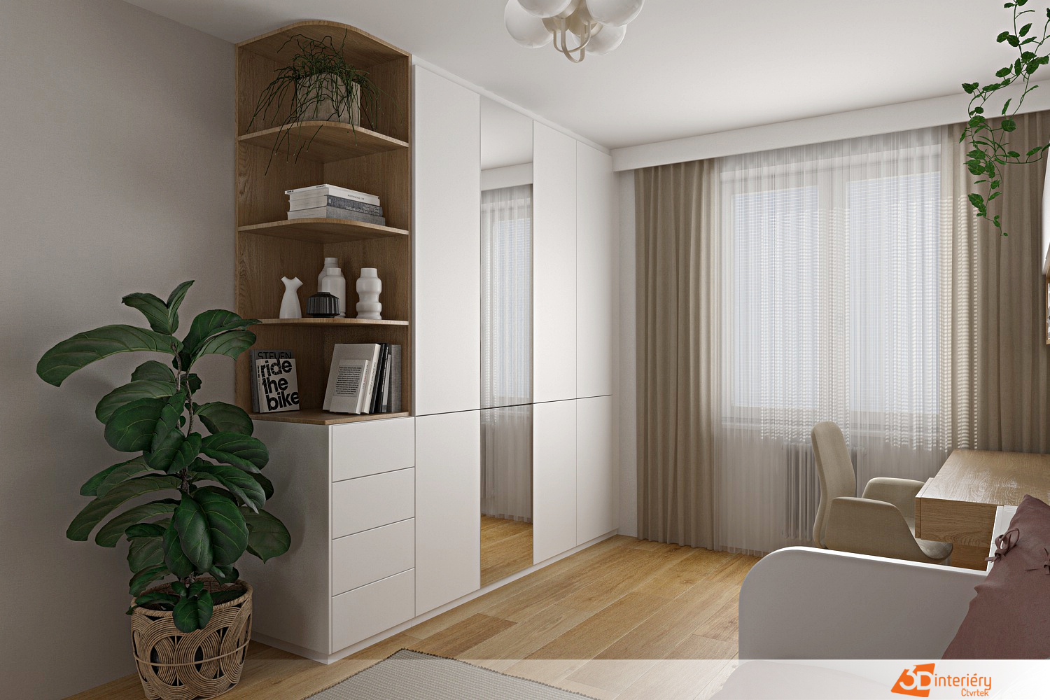 Vedle prostorné skříně se nachází velká zelená rostlina. Široké listy vyrůstají směrem ke světlu a přinášejí do pokoje přírodní klid. Květina tvoří rovnováhu k jemnému barevnému ladění a připomíná, že i ticho může růst.
