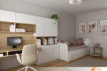 Dřevěná podlaha nese huňatý koberec, kde se dají roztáhnout nohy i myšlenky. Celý pokoj působí vyrovnaně – podporuje soustředění, odpočinek i tvořivost. Slečna tu nachází vlastní rytmus, místo pro své sny i plány.