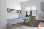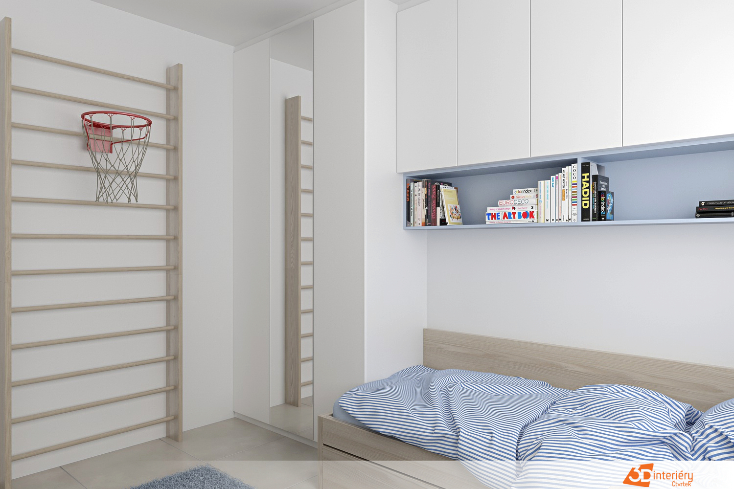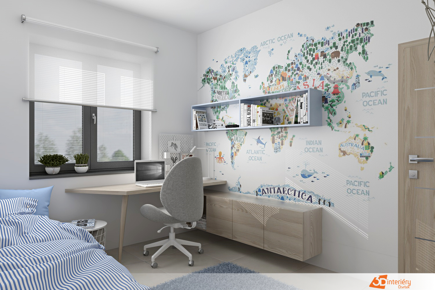 V rohu místnosti odpočívá postel s pastelově modrou peřinou. Barva připomíná letní oblohu nebo klidné moře. Na polštáři leží knížka, kterou někdo nedočetl před usnutím. Celý kout působí měkce a bezpečně. Naproti posteli se rozkládá stěna s velkou mapou kontinentů. Afrika, Asie, Evropa, oba americké světadíly i Austrálie získaly prostor v přesném rozvržení. Názvy měst, hor a řek motivují k objevování, plánování a snění o dalekých cestách.