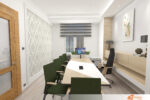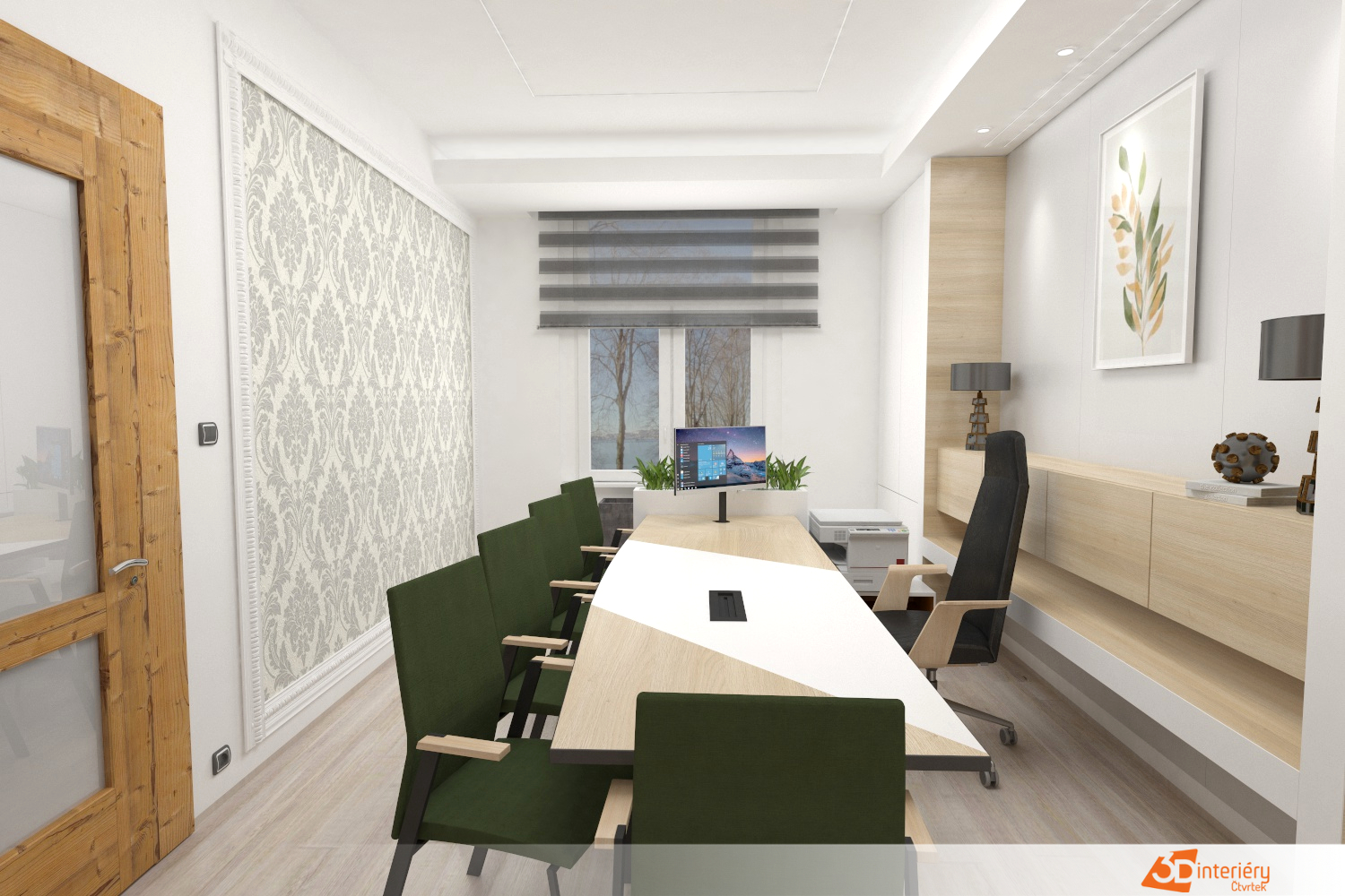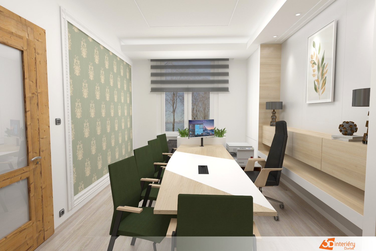 Celý prostor podporuje efektivní práci i příjemné pracovní prostředí. Elegantní tapeta, dlouhý stůl a promyšlené detaily vytvářejí kancelář, kde vznikají nápady, rozhovory i výsledky.