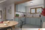 Modré skříňky vnášejí do kuchyně svěžest a energii. Jejich sytý odstín vytváří výrazný kontrast vůči parketové podlaze, která září přirozenou kresbou dřeva. Každý šuplík i dvířka skříňky působí pečlivě zpracovaně, úchytky ladí s celkovým stylem místnosti.