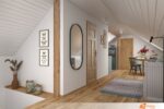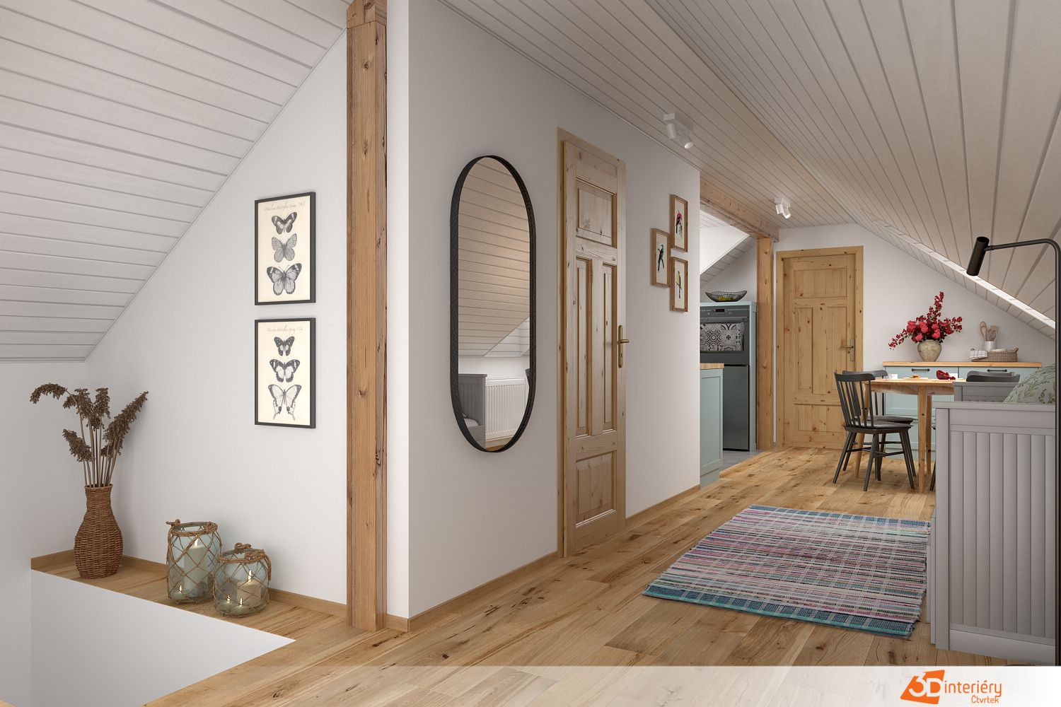 Na bílé stěně visí oválné zrcadlo. Rám působí nenápadně, ale zrcadlová plocha chytře odráží světlo z okna i z místnosti, čímž opticky zvětšuje prostor. Sluneční paprsky, které pronikají dovnitř, vytvářejí na parketách jemné stíny a odlesky.