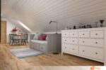 Uprostřed prostoru stojí kulatý dřevěný stůl. Jeho teplý tón přináší útulnost a přirozenost. Kolem stolu se rozmisťují černé židle s tenkou kovovou konstrukcí a pohodlným sedákem. Jejich jednoduchý design doplňuje celkovou estetiku a zároveň nabízí pohodlí při sezení.