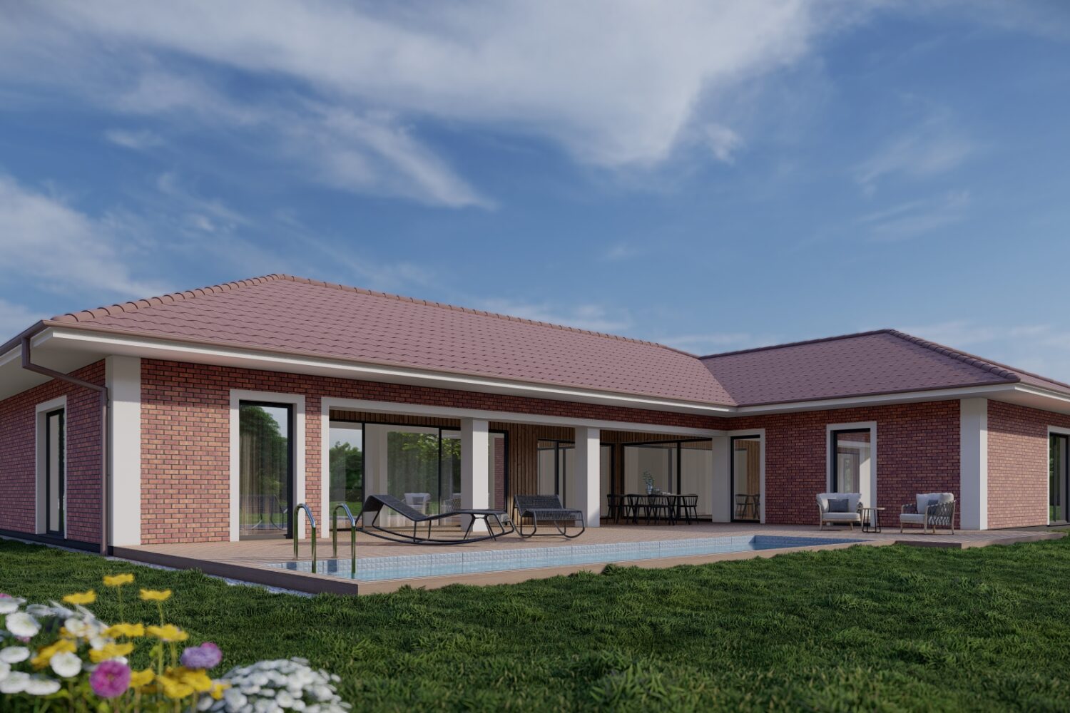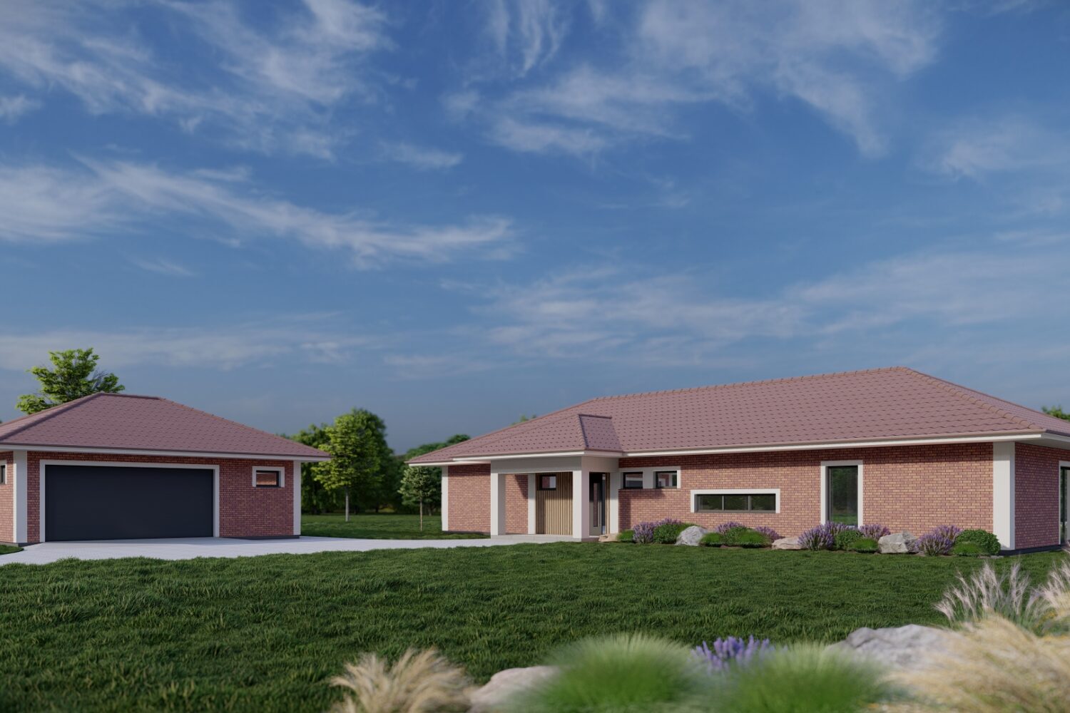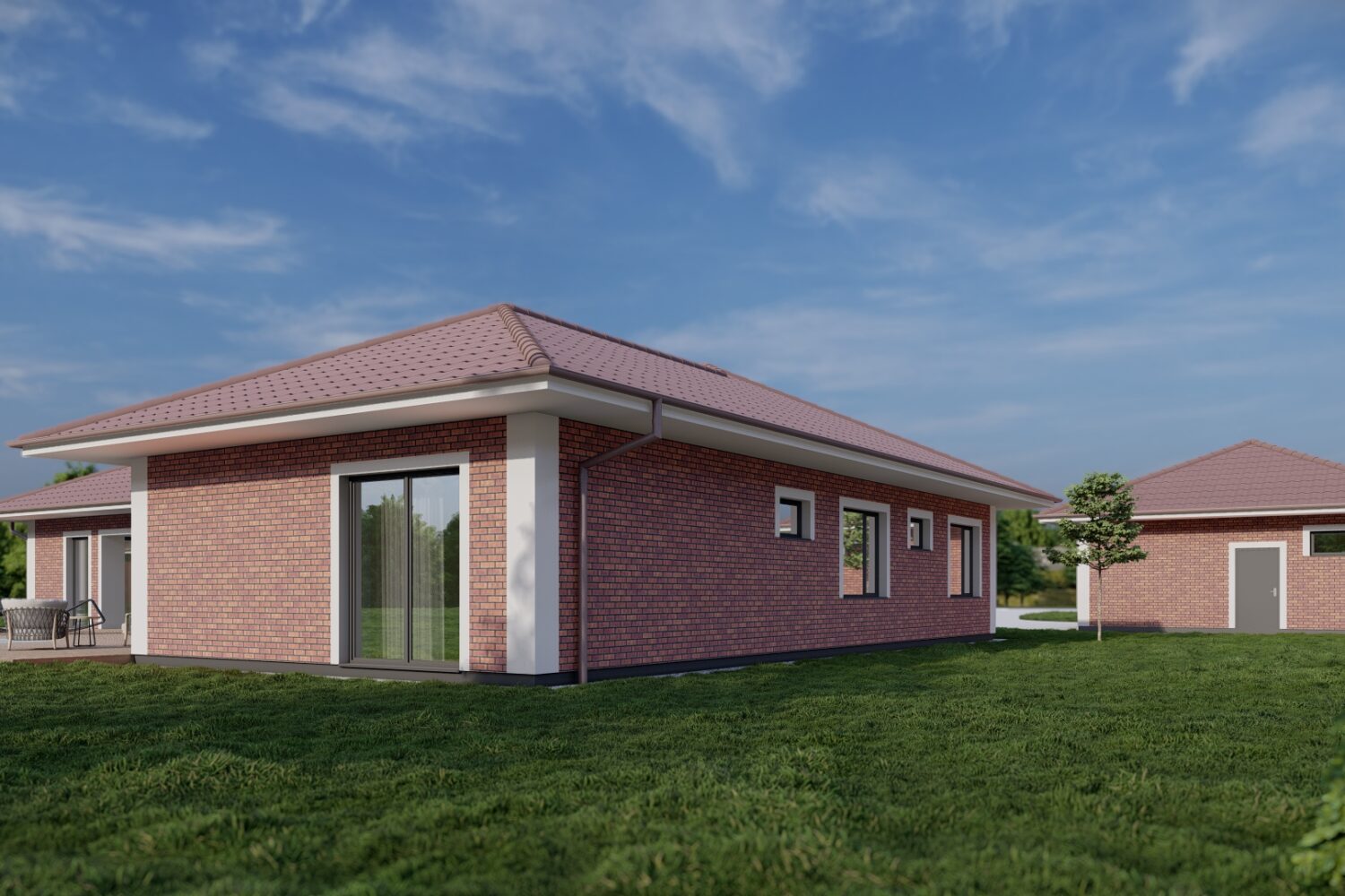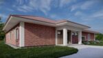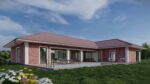 Fasáda z cihel ladí barevně s taškami na střeše, čímž vzniká harmonický a sjednocený vzhled celého domu. Teplé odstíny cihel navazují na střešní krytinu, což přináší do architektury pocit celistvosti a promyšlenosti. Barvy se vzájemně doplňují, aniž by působily monotónně, díky jemným rozdílům v tónech.