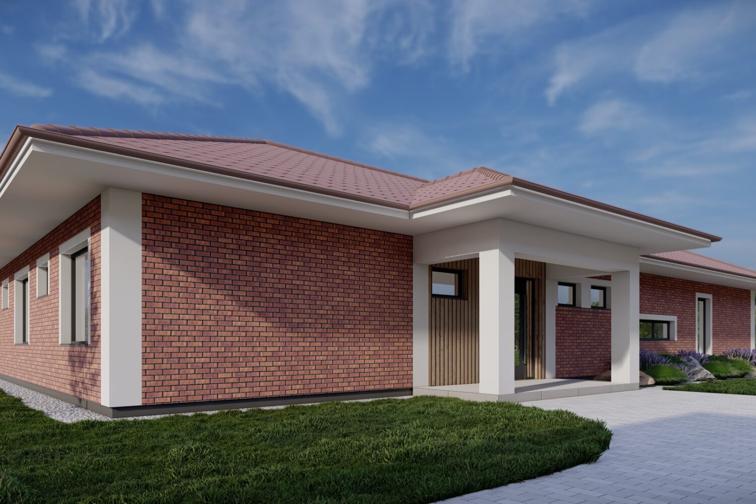 Cihelná fasáda představuje klasický materiál s dlouhou tradicí, který dokáže navodit příjemnou atmosféru domova. Spojení s bílými detaily rohových částí vytváří moderní interpretaci tradičního stylu. Tašky a cihly společně vytvářejí dojem pevnosti, zatímco bílá barva přidává svěžest a kontrast.