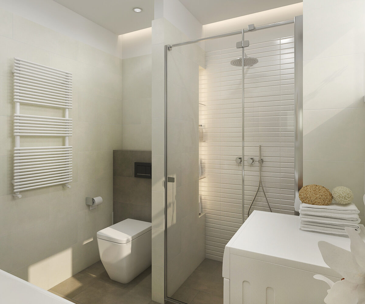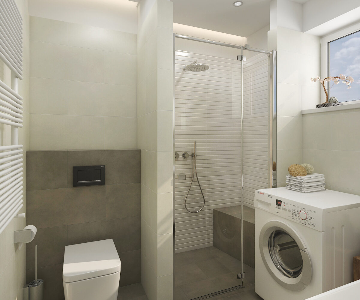 Vedle sprchového koutu se nachází toaleta, která využívá prostor efektivně a nenarušuje celkový dojem koupelny. Pečlivě zvolené prvky a jejich umístění zajišťují pohodlný pohyb v místnosti.