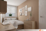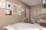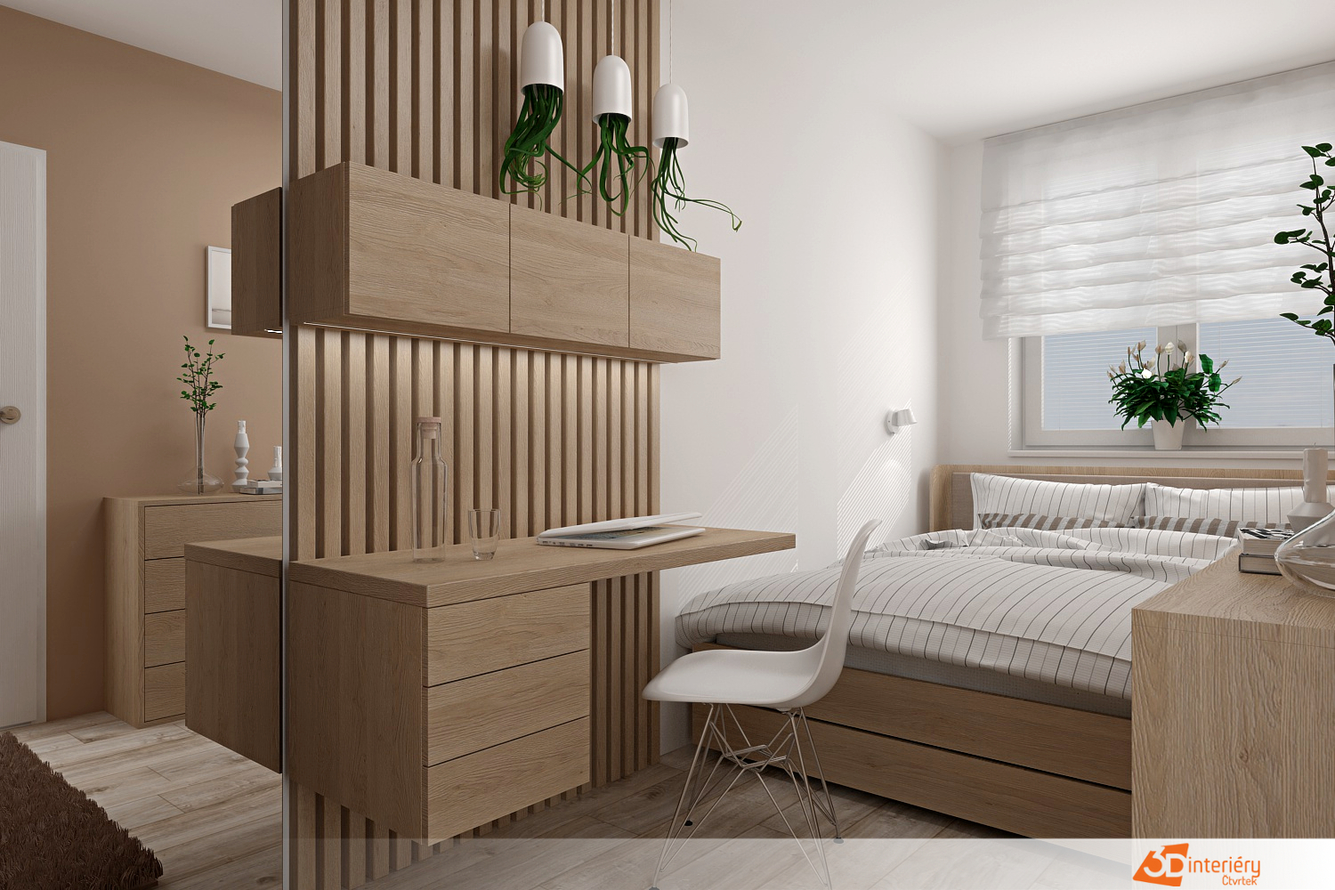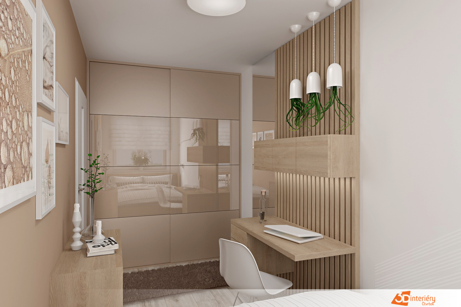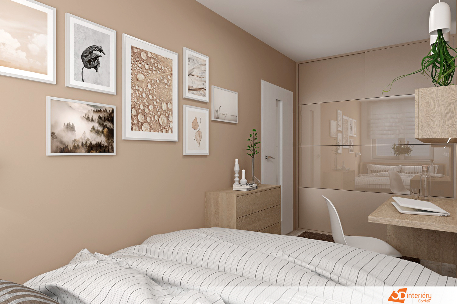 Každý kus nábytku vznikl na míru, s ohledem na velikost místnosti i potřeby uživatelů. Podlahu pokrývá přírodní dřevěná podlaha, která podtrhuje celkové ladění. Místo nad postelí zdobí jednoduchá grafika v neutrálních tónech, doplněná jemným osvětlením. Okenní rolety v béžové barvě slouží nejen k zatemnění, ale také vizuálně doplňují zeď i nábytek.
