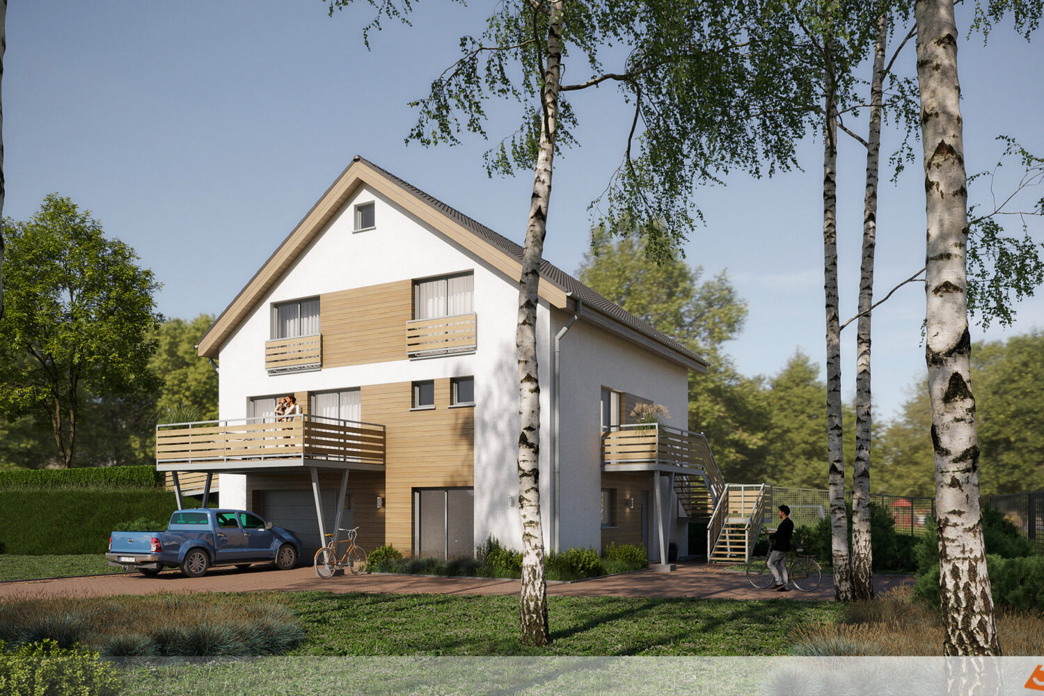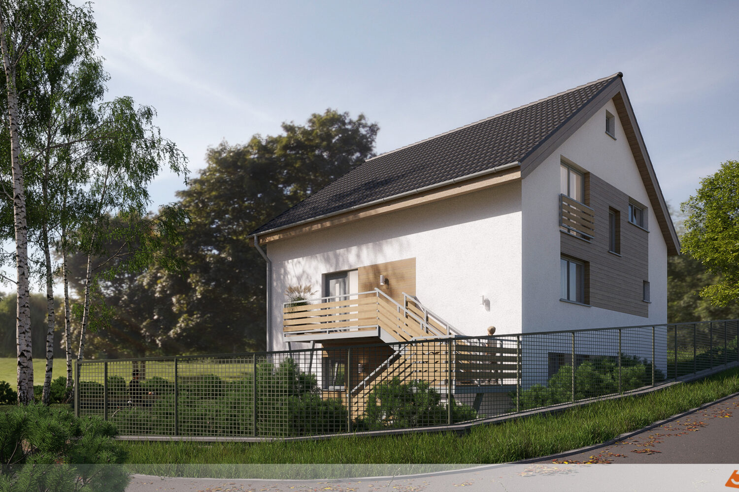 Okolo oken a mezi nimi se nacházejí světlé dřevěné obklady, které vytvářejí zajímavý kontrast k bílé ploše. Světlo dřevo dodává fasádě přírodní teplo a texturu, která působí útulně a příjemně na pohled. Jemné tóny dřeva ladí s balkonem, jehož konstrukce rovněž využívá tento přírodní materiál. Tento vizuální most mezi fasádou a balkonem působí harmonicky a sjednocuje celkový vzhled domu.