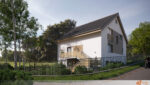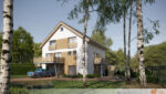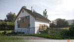 Celkový vzhled domu působí svěže a příjemně, přičemž bílé plochy a dřevěné detaily spolupracují na vytvoření estetického a zároveň útulného prostředí. Fasáda nabízí spojení modernosti s přírodou, které zaujme na první pohled.