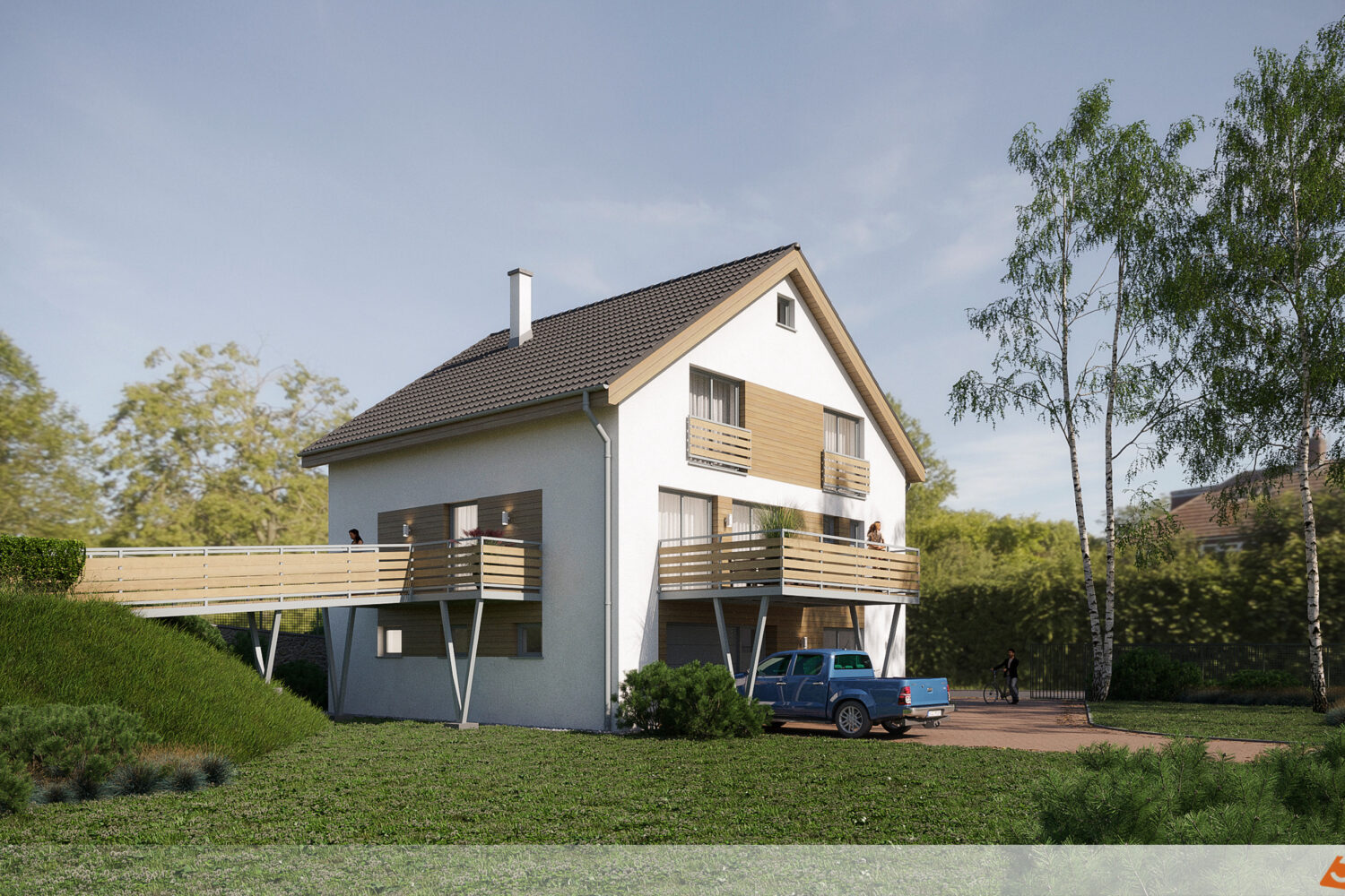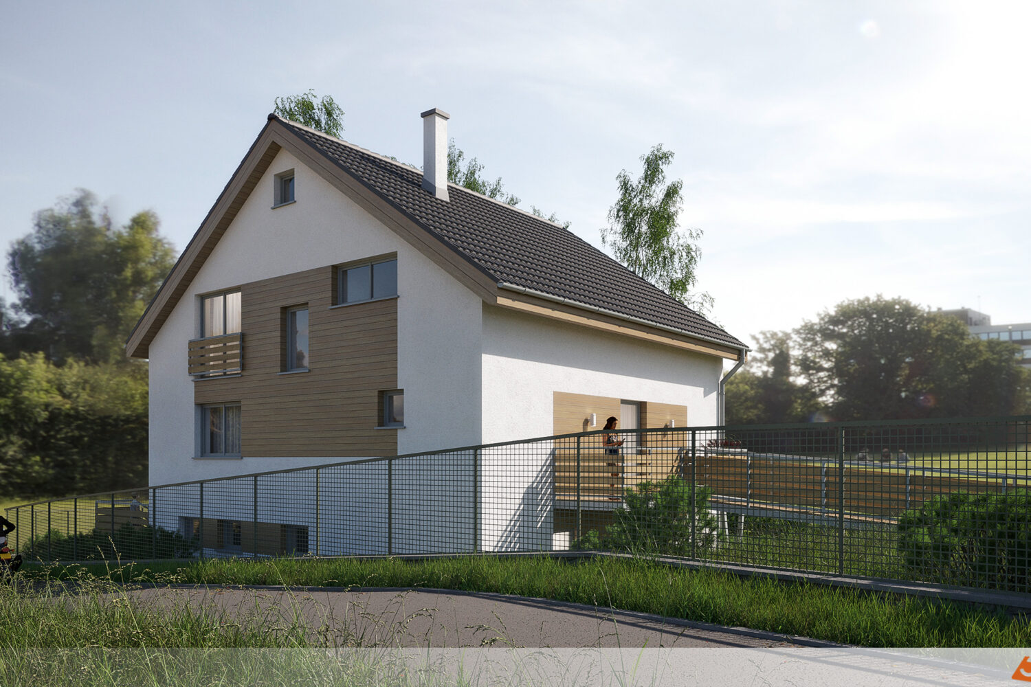 Jak sladit bílou fasádu s dřevěnými detaily a balkonem?