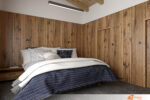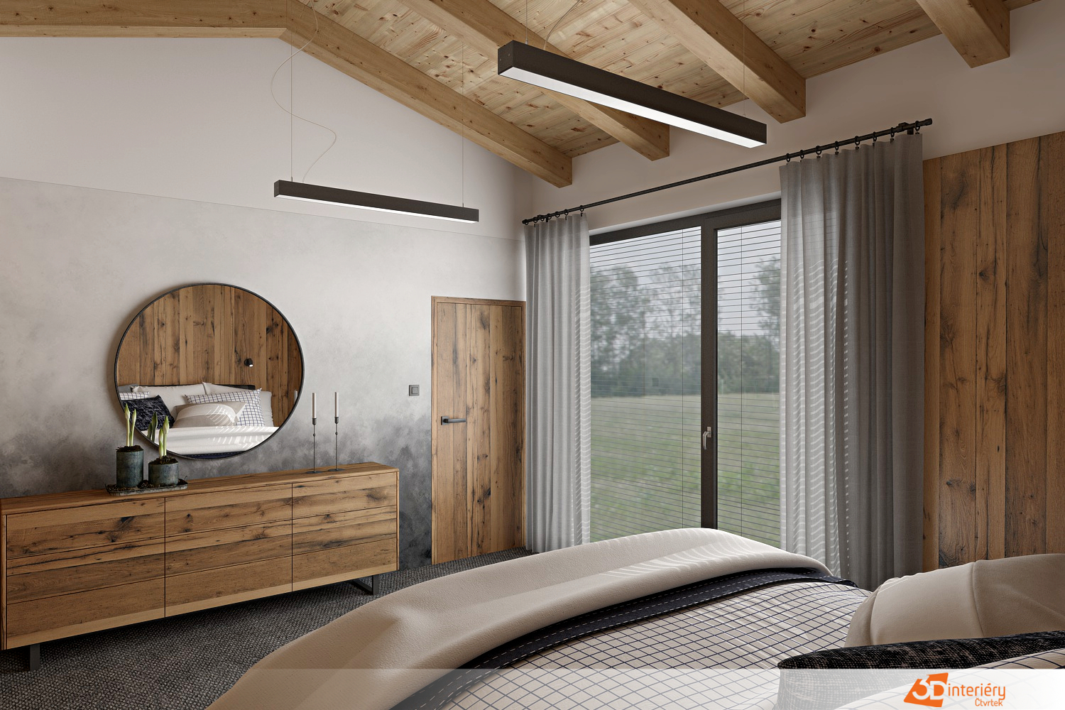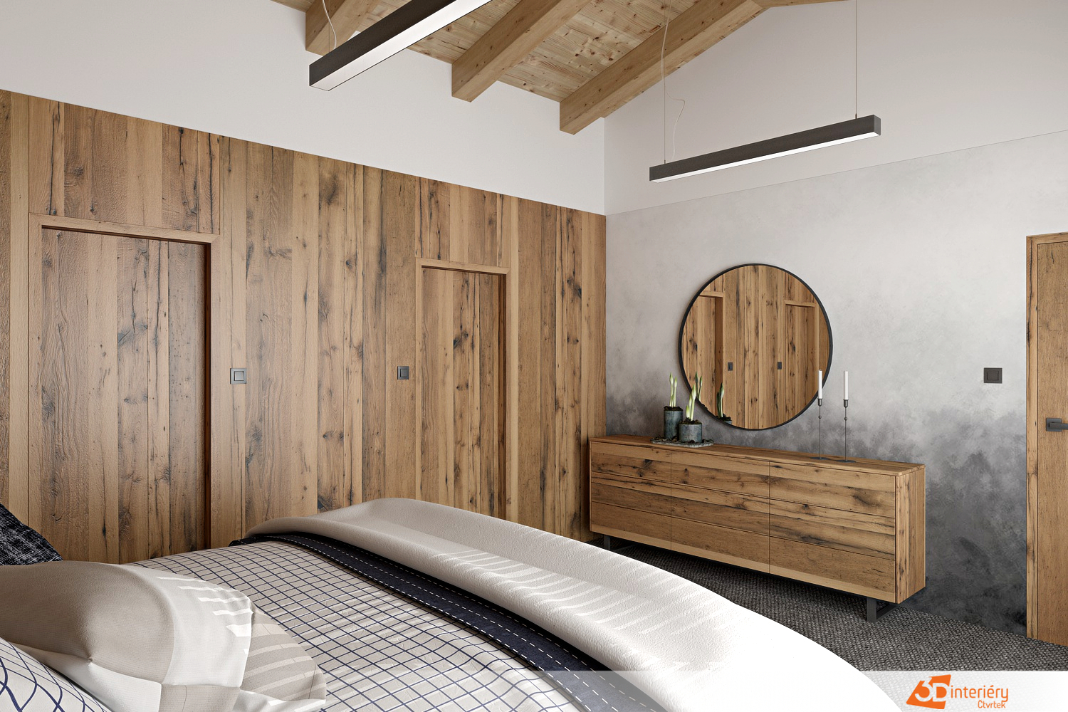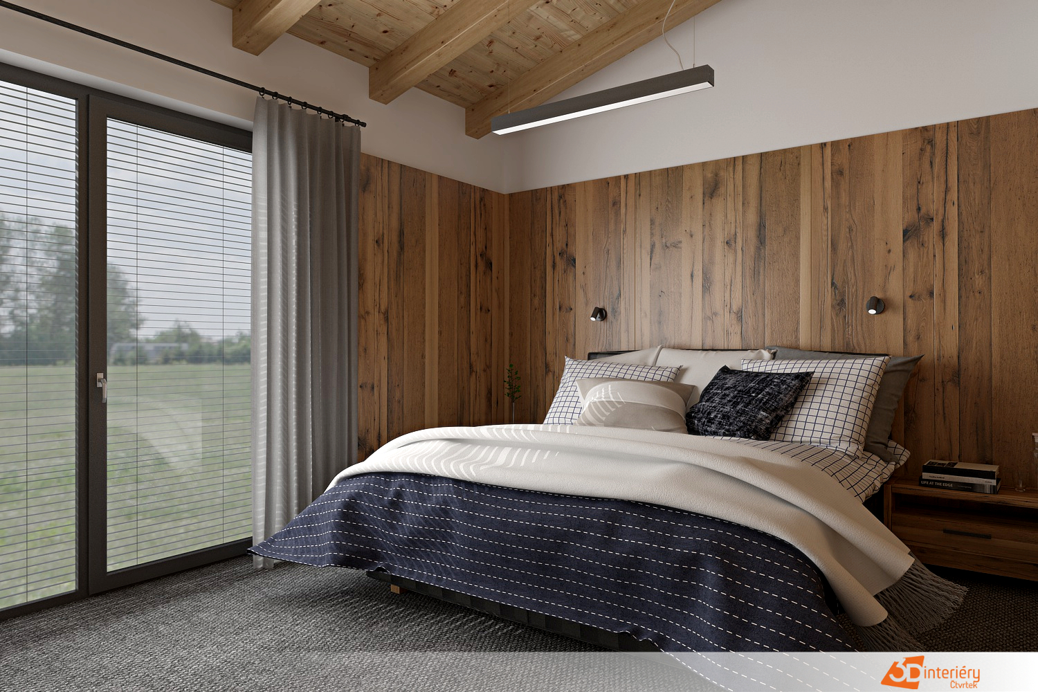 Ložnice dýchá teplem přírodních materiálů a útulnou atmosférou. Dominantním prvkem zůstává dřevo, které pokrývá nejen podlahu, ale i většinu stěn. Tmavé dřevěné obložení sahá až do tří čtvrtin výšky stěn, zatímco horní část zůstává bílá, což vytváří zajímavý kontrast a pocit vzdušnosti. Celkový dojem působí harmonicky a klidně, bez zbytečných výstřelků.