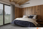 Nábytek v místnosti ladí s tmavým dřevem na stěnách. Postel, noční stolky i komoda tvoří jednotný celek, který podporuje dojem sofistikovaného a přitom přirozeného prostoru. Každý kus nábytku nese jednoduché linie a zdůrazňuje materiál, nikoli zdobnost.