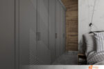 Na jedné straně ložnice stojí velká šedá skříň, která sahá od podlahy ke stropu. Svojí neutrální barvou doplňuje celkový koncept bez narušení teplé barevné palety. Poskytuje dostatek úložného prostoru a zároveň slouží jako výrazný, ale nenápadný prvek. Kombinace dřeva a šedé barvy vytváří nadčasový interiér vhodný pro každodenní odpočinek i soustředění.