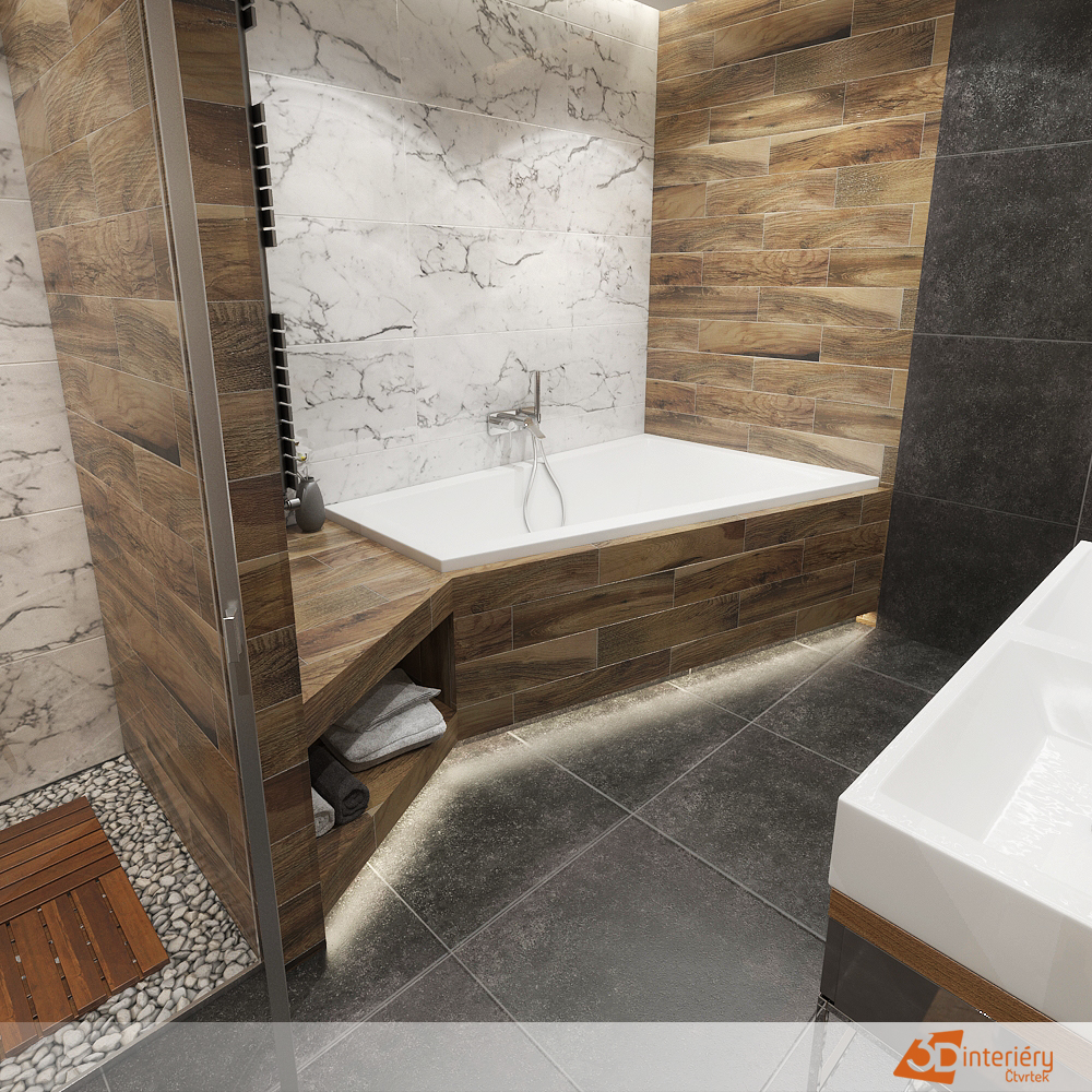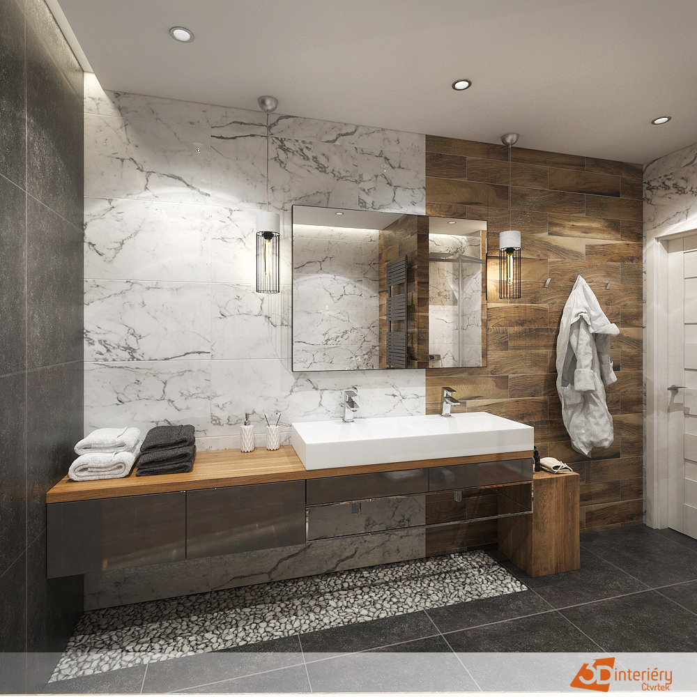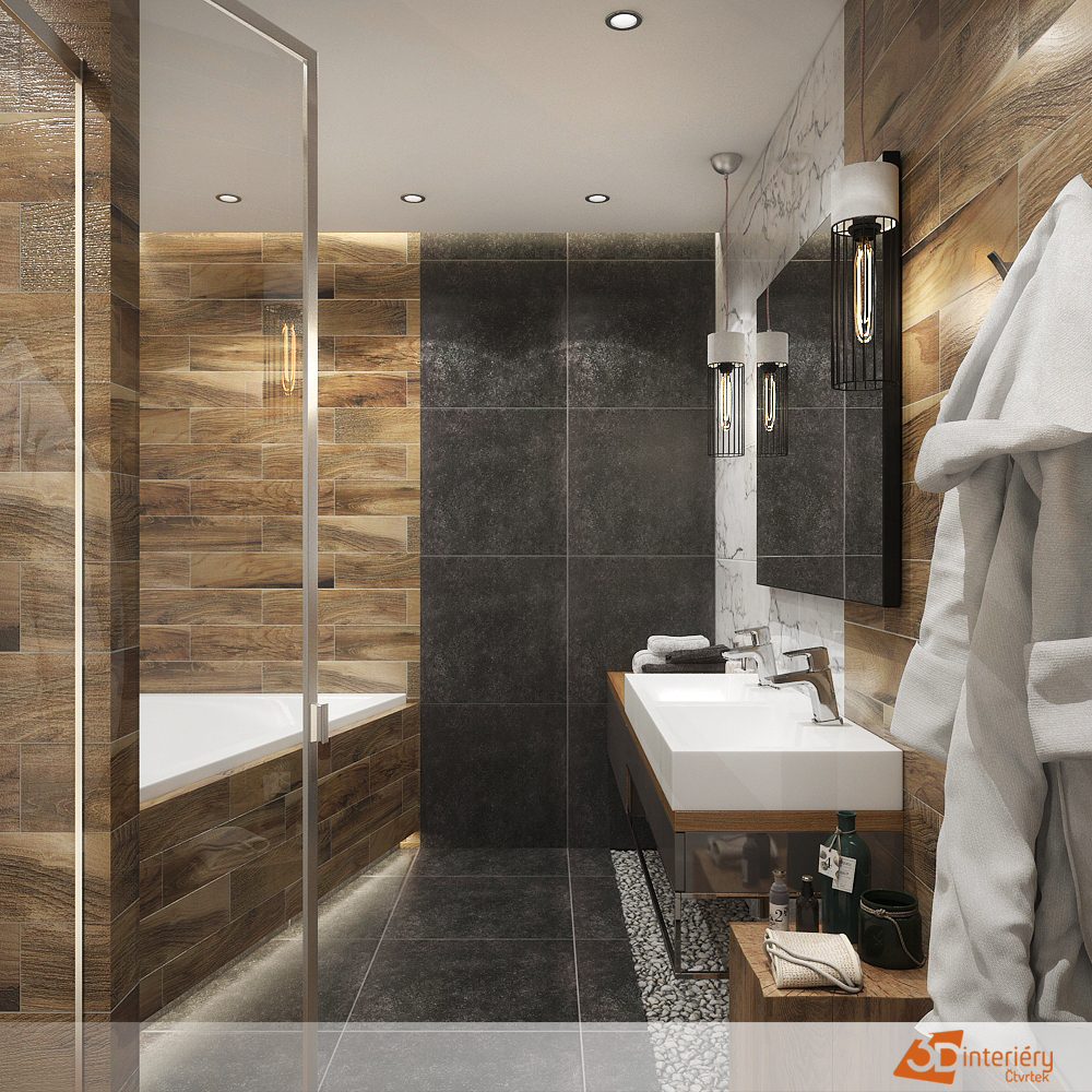 Jaký obklad zvolit do koupelny? Kontrast černé, dřeva a mramoru