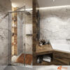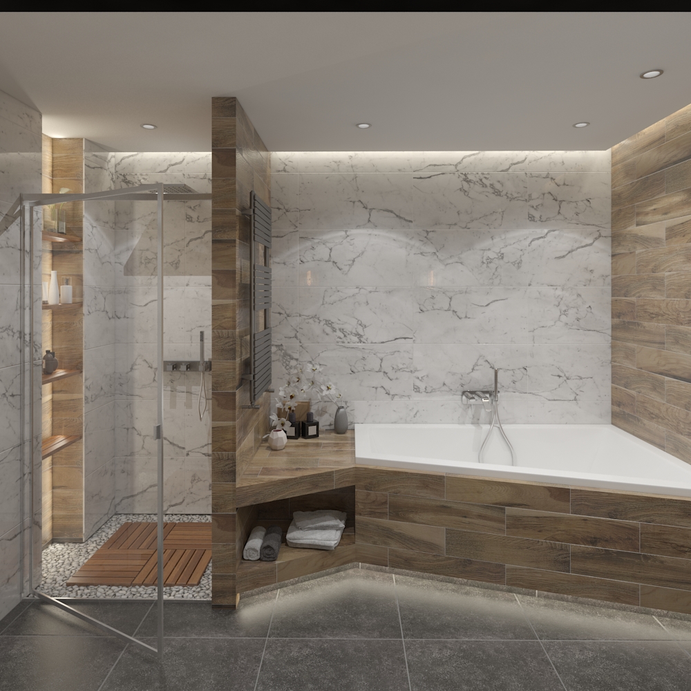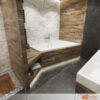 Za vanou se táhne stěna z bílého mramoru. Žíly v kameni se vinou jemně, jako náhodná kresba přírody. Mramor přináší lehkost a zároveň luxusní nádech. Vana stojí volně, v dialogu s prostorem. Hned vedle ní se nachází sprchový kout – oddělený sklem, ale součást jednoho celku.