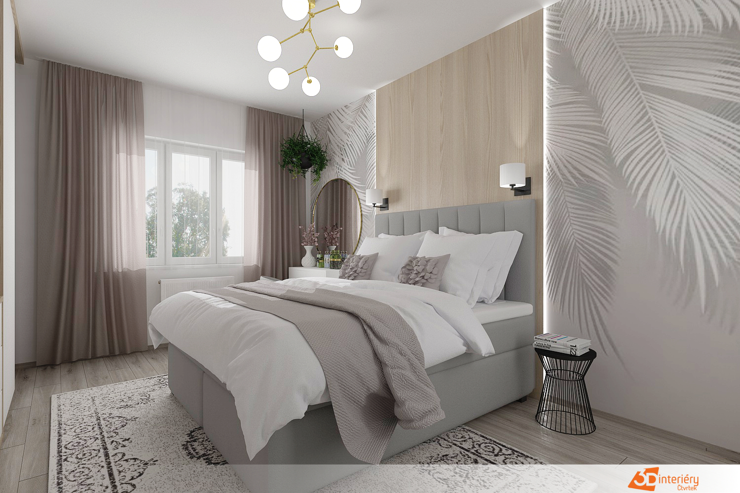 Nad postelí visí černobílé obrázky v tenkých rámech. Jejich jednoduchost a kontrastní barevnost skvěle doplňují jinak jemné ladění místnosti. Na hlavní stěně se nachází tapeta s motivem bílého peří. Vzor působí lehce, jako by se vznášel ve vzduchu, a podtrhuje celkovou vzdušnost interiéru.